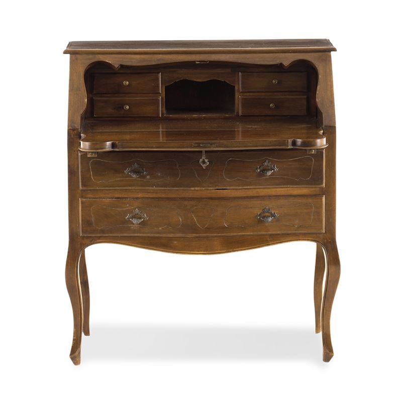 Fronte a due cassetti e ribalta che cela cassettini e scomparti, gambe mosse