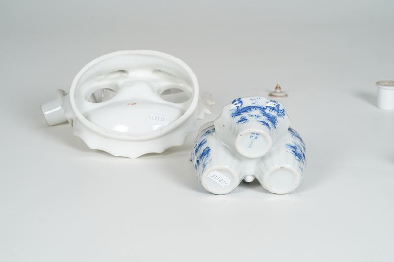 Porcellana. Altezza massima cm 12. Conservazione: scrittoio a forma di conchiglia con sbeccatura e usure all'oro; restauri al servizio con decorazione floreale.