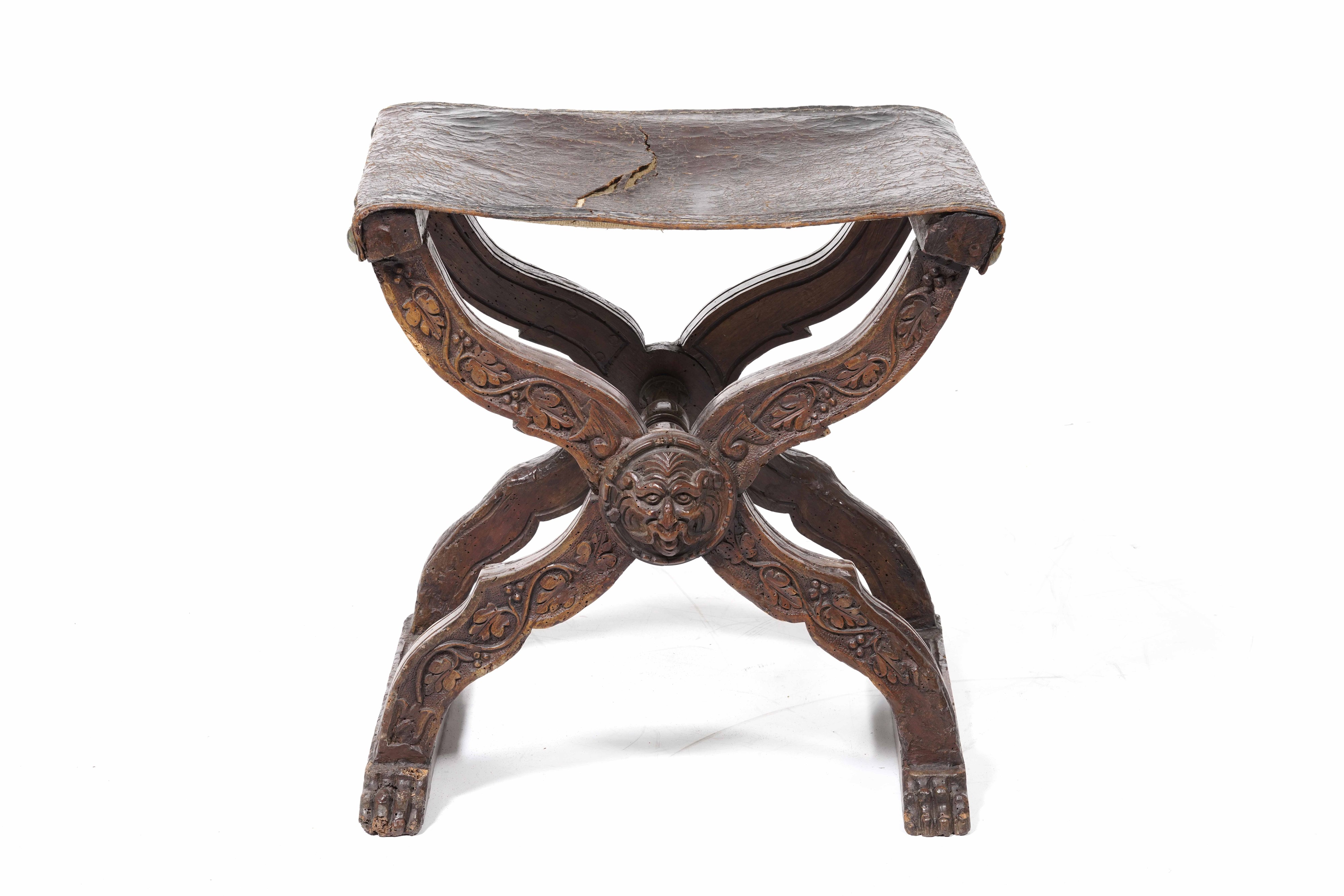 Gambe decorate a tralci di vite e mascherone, piedi ferini, seduta in pelle
