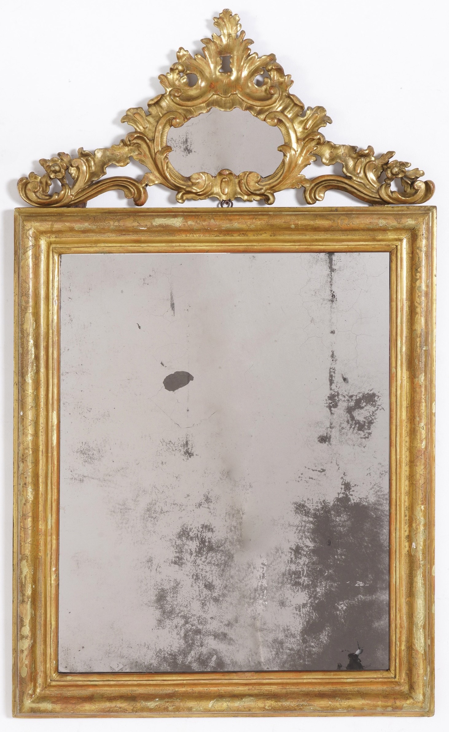 Cimasa con decori a fiori e pellacce centrata da specchierina