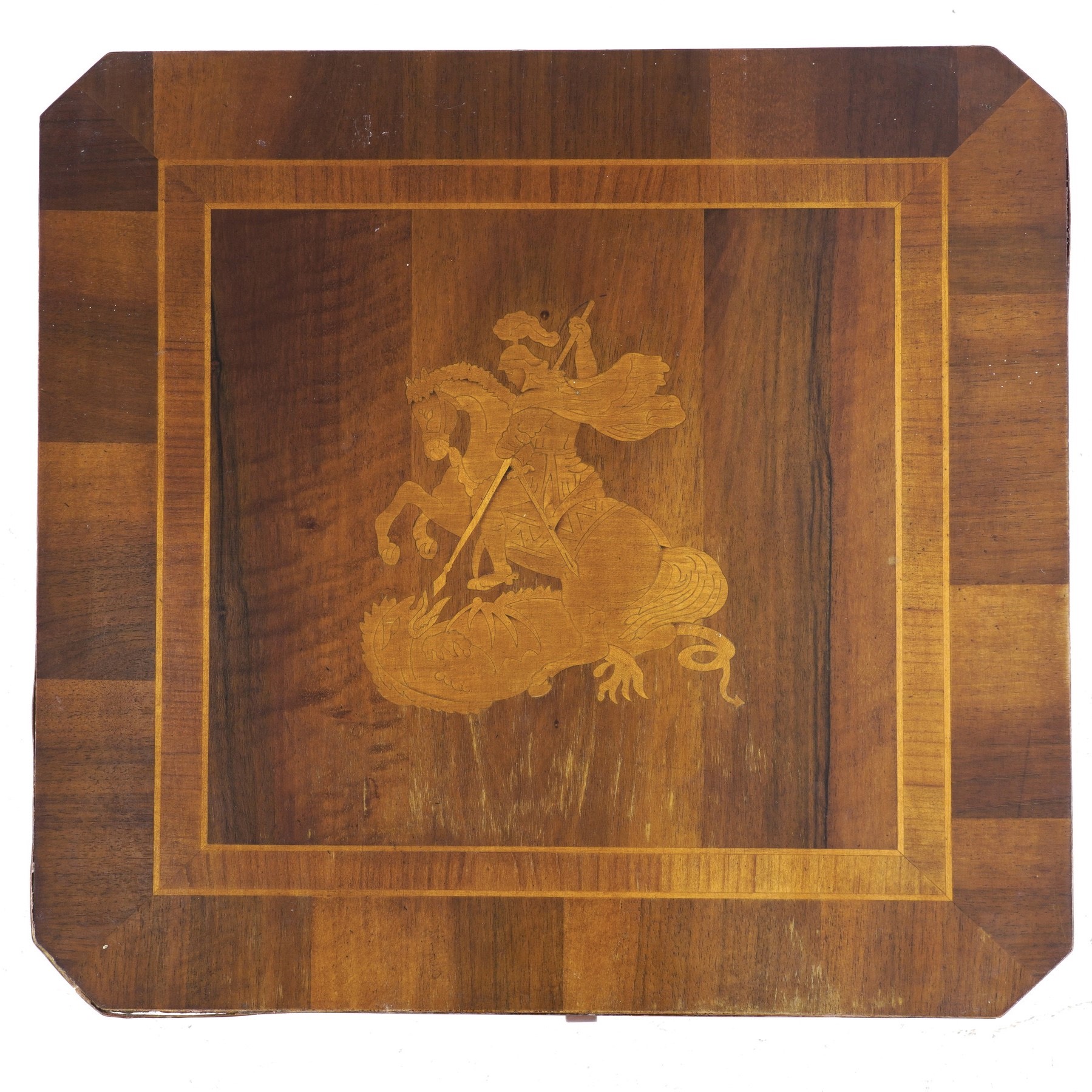 Piano intarsiato con San Giorgio che uccide il drago, fusto tornito, tripode