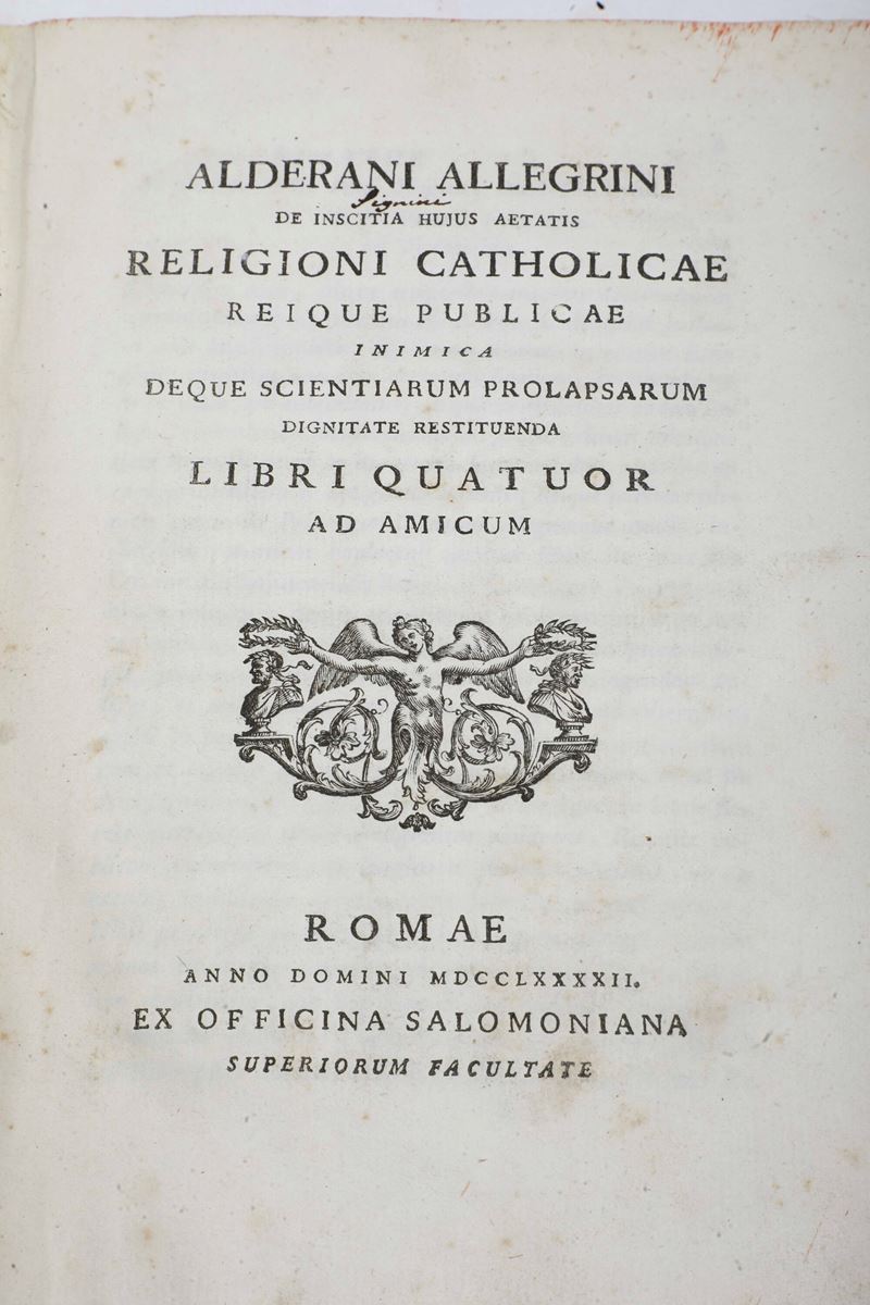 Allegrini Alderano De inscitia hujus aetatis religioni catholicae.. Romae, ex Officina Salomoniana, 1792