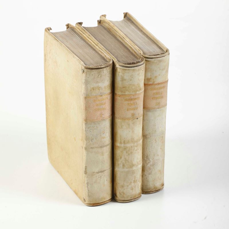 Tre tomi In-8°. Rilegature coeve in piena pergamena ex libris a timbro ai tre forntespizi.