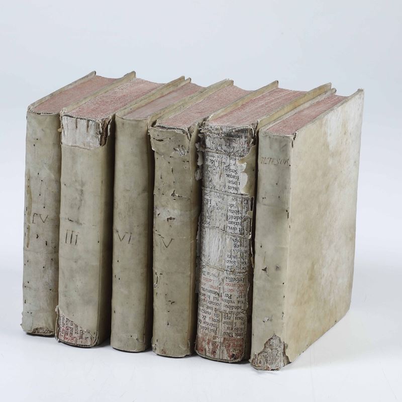 In-4°. Sei volumi. Rilegature coeve in piena pergamena, con mancanze e difetti ad alcuni volumi. Seconda edizione