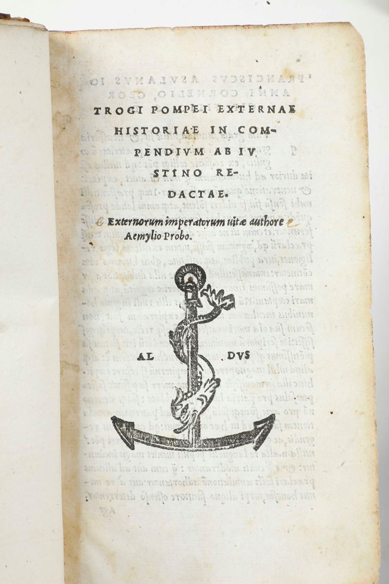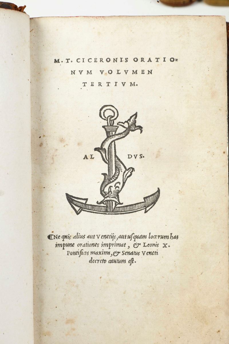 In 8°. Bella rilegatura coeva a pelle impressa con impressioni in oro. Dorso ricostruito in stile. Si uniscono nel lotto: M.T Cicerone Orazionem volumen secundum, Venezia In Aedibus Aldi et andrea soceri 1519; M. T Cicerone Oratione volumen tertio, Venezia, In Aedibus Aldi et andrea soceri, 1519; Trogi Pompei Externae historiae in compendium ab iustino redacta, Venezia In Aedibus Aldi et andrea soceri, 1522