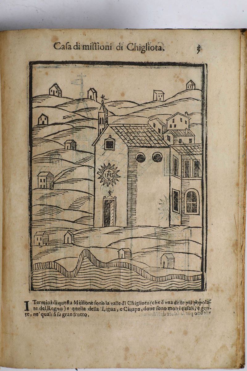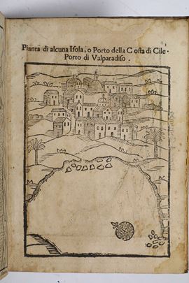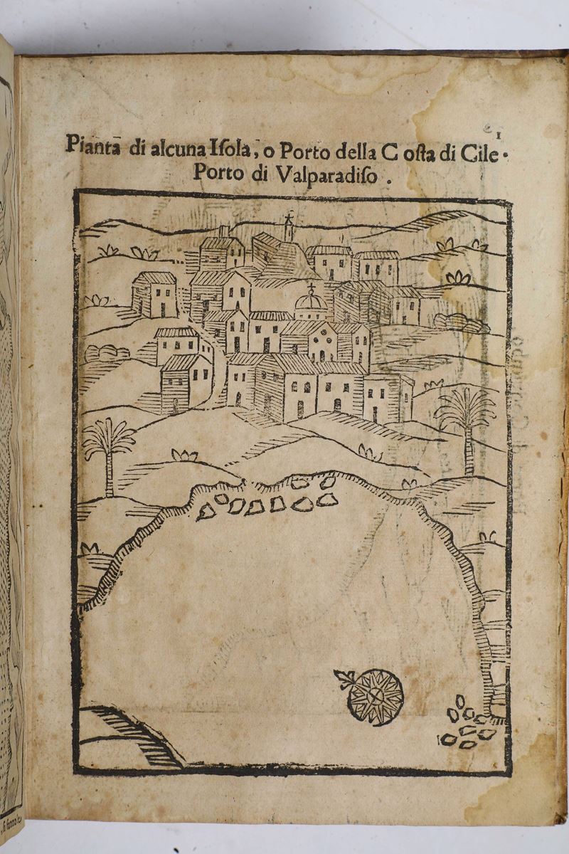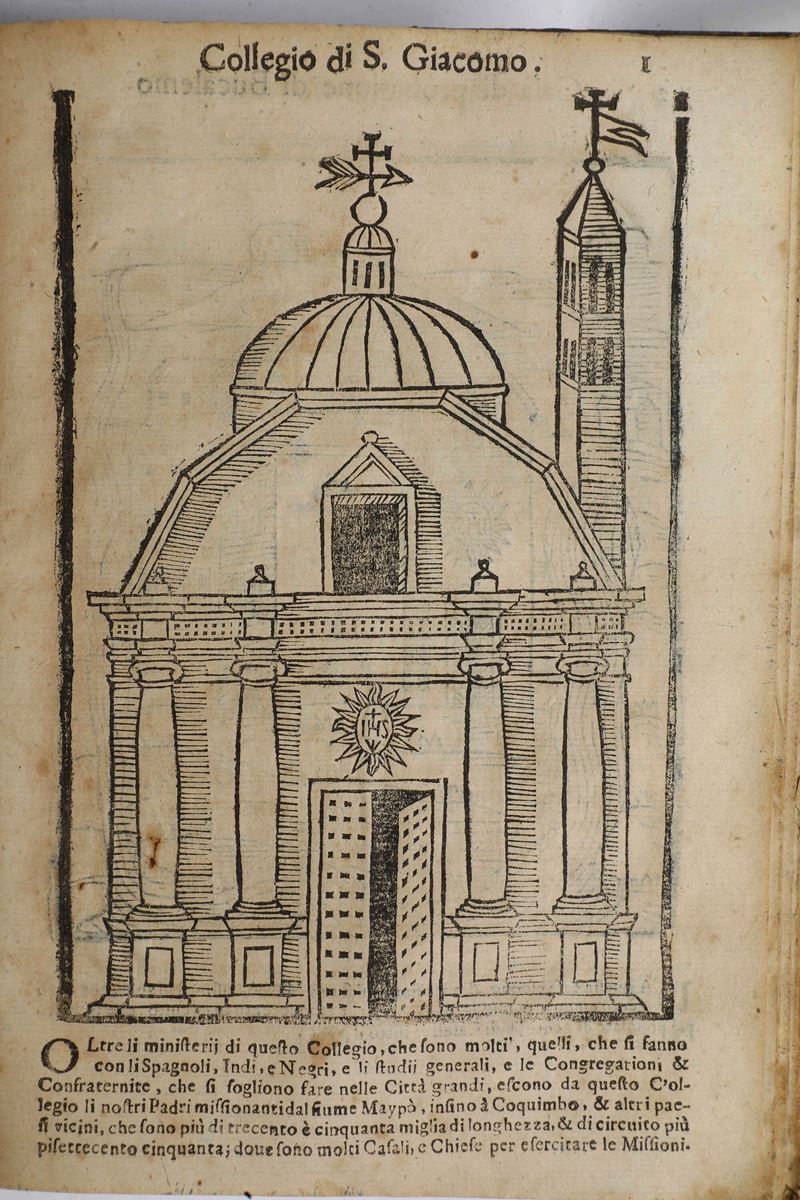 In-4°. Legatura del secolo XVIII in pergamena floscia (macchie, rari fori di tarlo). Al termine dell'opera dodici vedute a tutta pagina di monumenti cileni e sei carte geografiche. Prime carte riattaccate, bruniture, piccoli restauri, piccoli strappetti marginali, alcune note manoscritte. Esemplare rifilato con piccola perdita di testo