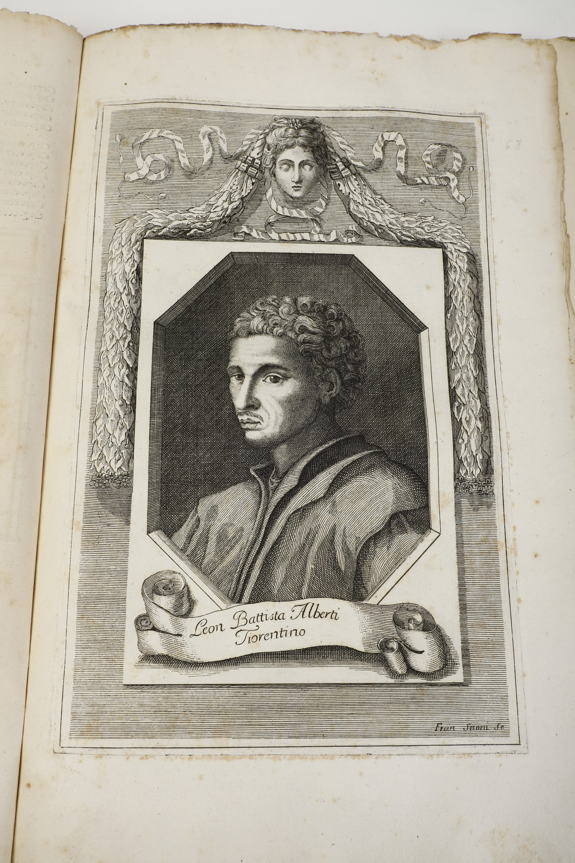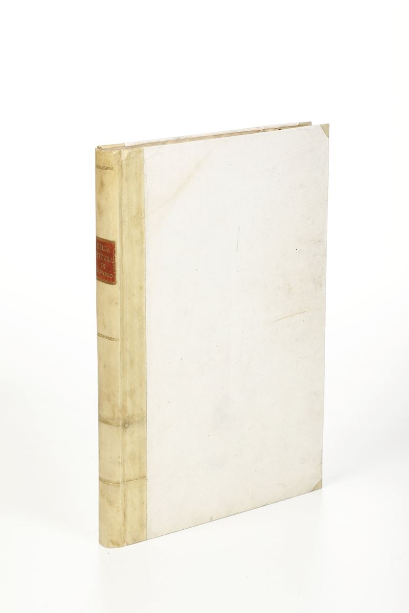 In-folio. Rilegatura in mezza pergamena moderna. Bel ritratto a tutta pagina di Leonardo e diverse incisioni nel testo. Esemplare in barbe, con alcune pagine brunite e note manoscritte da mano antica, fori di tarlo al frontespizio
