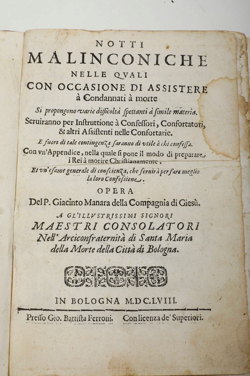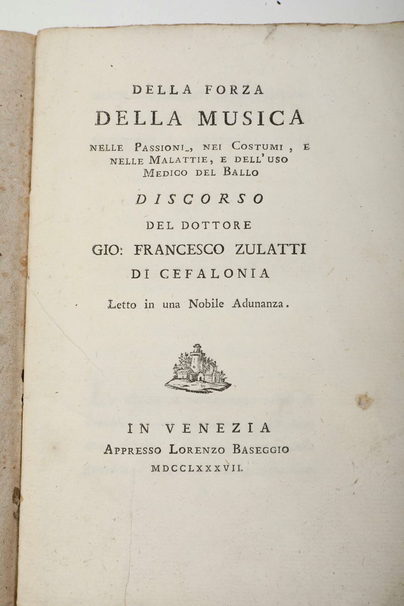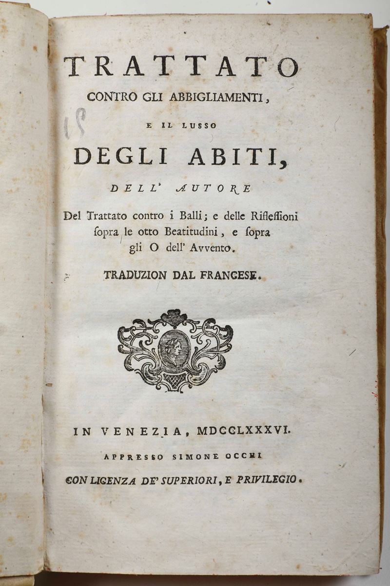 In-8°. Rilegatura coeva in piena pelle. Si aggiungono nel lotto: Giò Francesco Zulatti, della forza della Musica, in venezia, Baseggio, 1787; Trattato contro gli abbigliamenti e il lusso degli abiti... traduzione dal francese, in Venezia, appresso Simone Occhi, 1786; Padre Giacinto manara, notti malinconiche nelle quali con l’occasione di assistere i condannati a morte si propongono varie difficoltà spettanti a simile materia... in Bologna Giò Battista Ferroni, 1658, (bruniture e gore, mancanza di una porzione dell’ultima) carta; La verge de Jacob, ou l’art de trouver les tresors, les sources, les mineraux, e autres chose caches, a Lion 1693; Andoche Morel, la canonisation de S. Francois de sales, a Grenoble, chez Robert Philippes, 1665