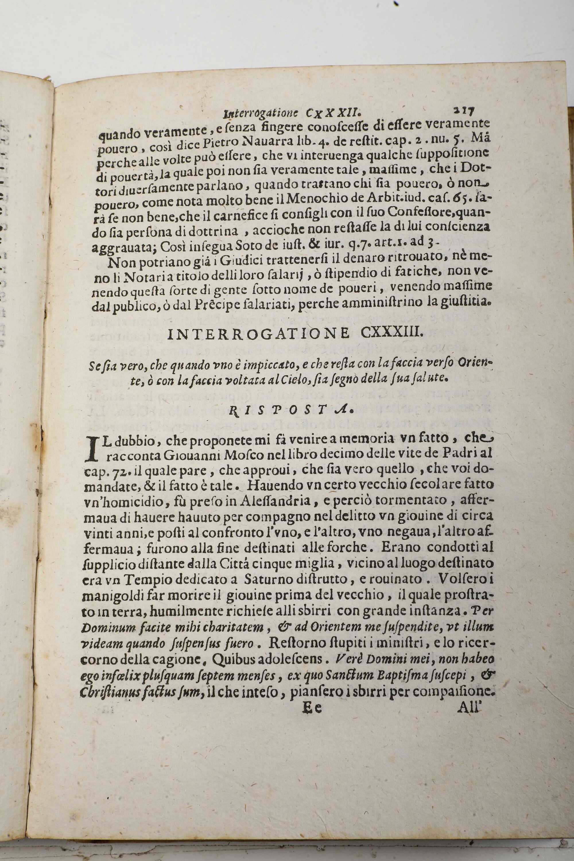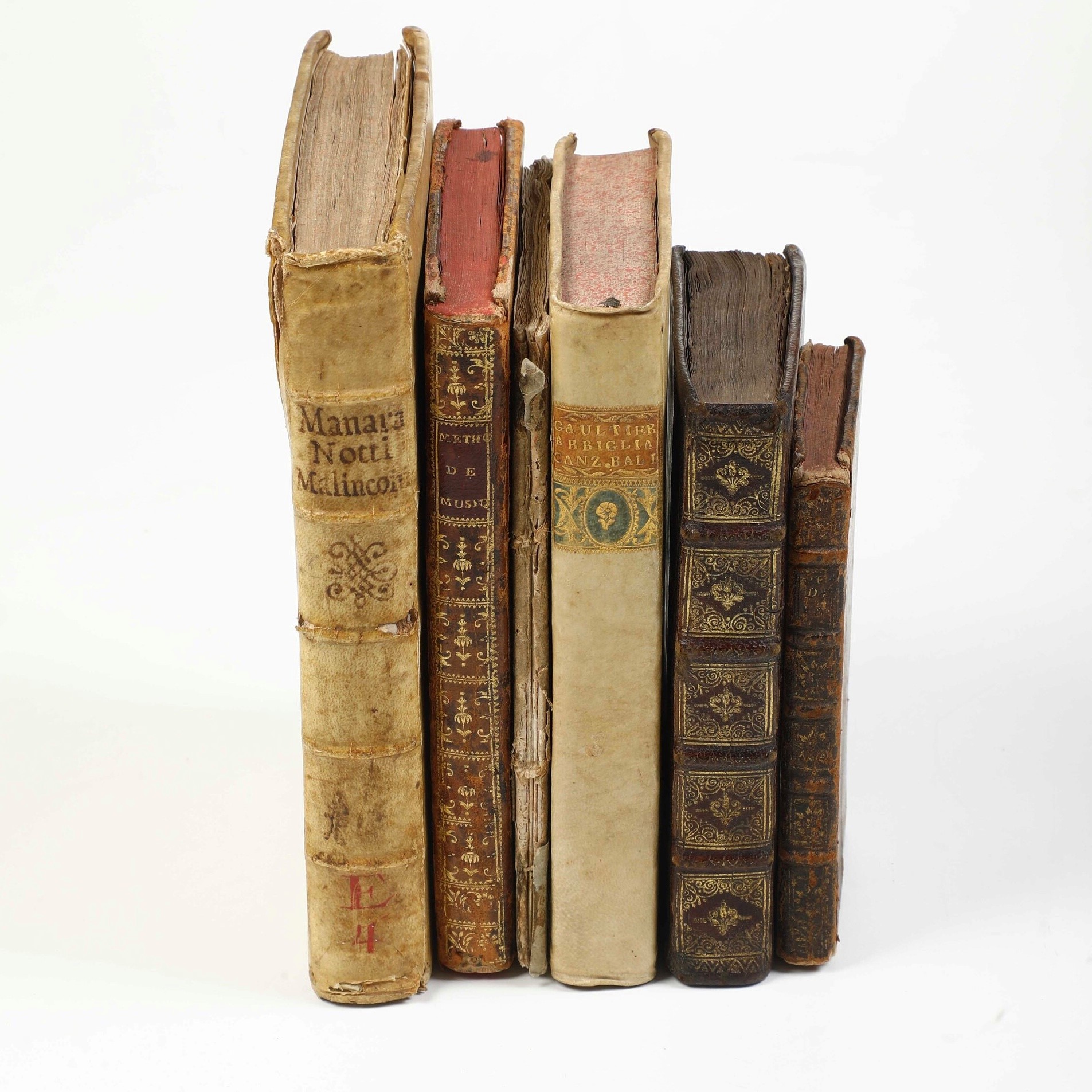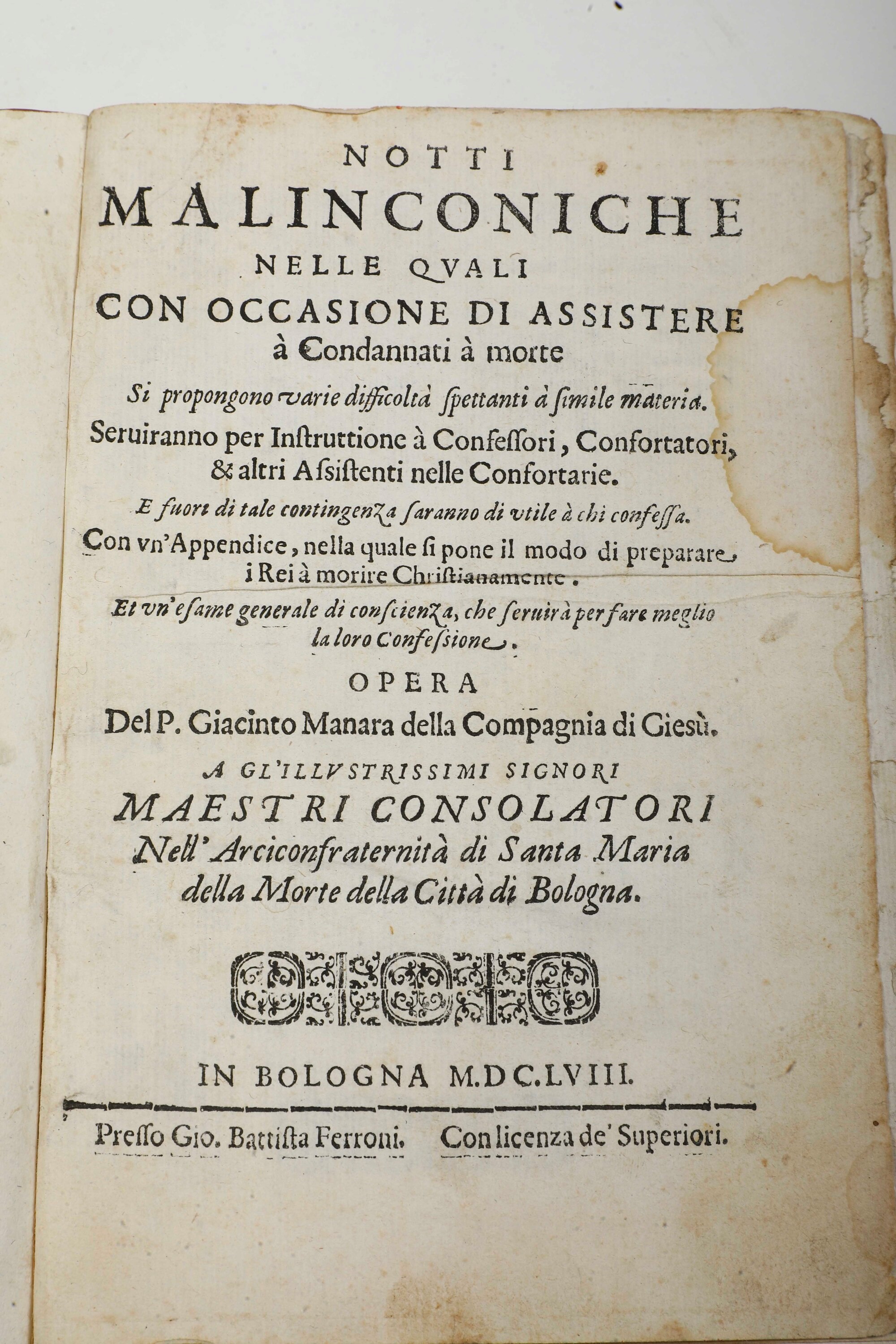 In-8°. Rilegatura coeva in piena pelle. Si aggiungono nel lotto: Giò Francesco Zulatti, della forza della Musica, in venezia, Baseggio, 1787; Trattato contro gli abbigliamenti e il lusso degli abiti... traduzione dal francese, in Venezia, appresso Simone Occhi, 1786; Padre Giacinto manara, notti malinconiche nelle quali con l’occasione di assistere i condannati a morte si propongono varie difficoltà spettanti a simile materia... in Bologna Giò Battista Ferroni, 1658, (bruniture e gore, mancanza di una porzione dell’ultima) carta; La verge de Jacob, ou l’art de trouver les tresors, les sources, les mineraux, e autres chose caches, a Lion 1693; Andoche Morel, la canonisation de S. Francois de sales, a Grenoble, chez Robert Philippes, 1665