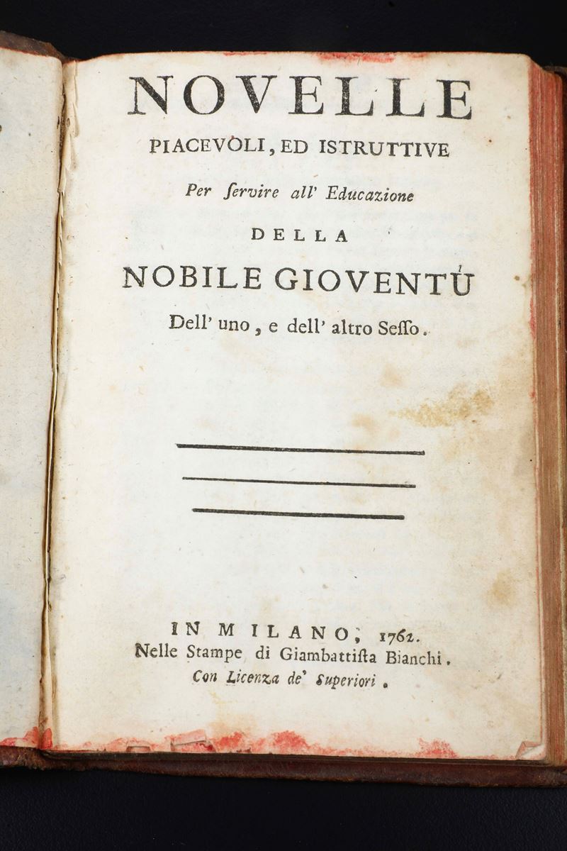 - Novelle piacevoli, ed istruttive per servire all'educazione della nobile gioventù..In Milano, nelle stampe di Giambattista Bianchi, 1762. In-8°. Rilegatura coeva in piena pelle con cornici impresse in oro, tagli rossi (usure). Esemplare un po' corto di margini, con qualche macchia soprattutto al frontespizio