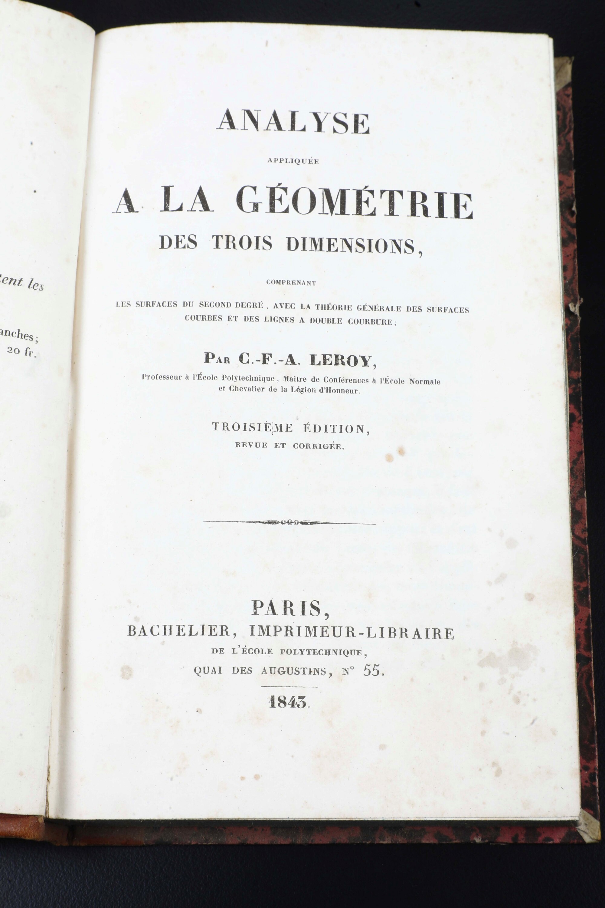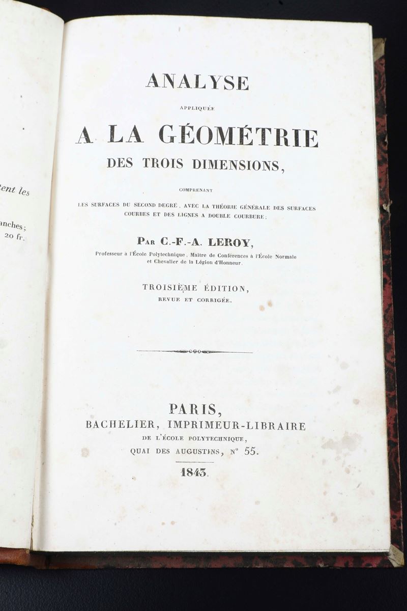 - Abbée Leroy, Analyse appliquée a la géométrie des trois dimensions. Paris, Bachelier, 1843. In-4°. Rilegatura in mezza pelle del secolo XIX, tagli verdi (usure). Alcune tavole geometriche più volte ripiegate in finale. Esemplare fresco, con qualche piccola macchia;