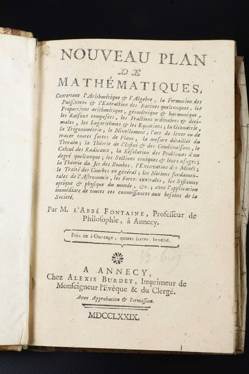 - Abbée Fontaine, Nouveau plan de Mathématiques..A annency, chez Alexis Burdet, 1779. In-4°. Rilegatura in mezza pergamena e punte del secolo XIX (usure e piccole mancanze). Tavole geometriche ripiegate in finale. Lievi bruniture e qualche macchia;