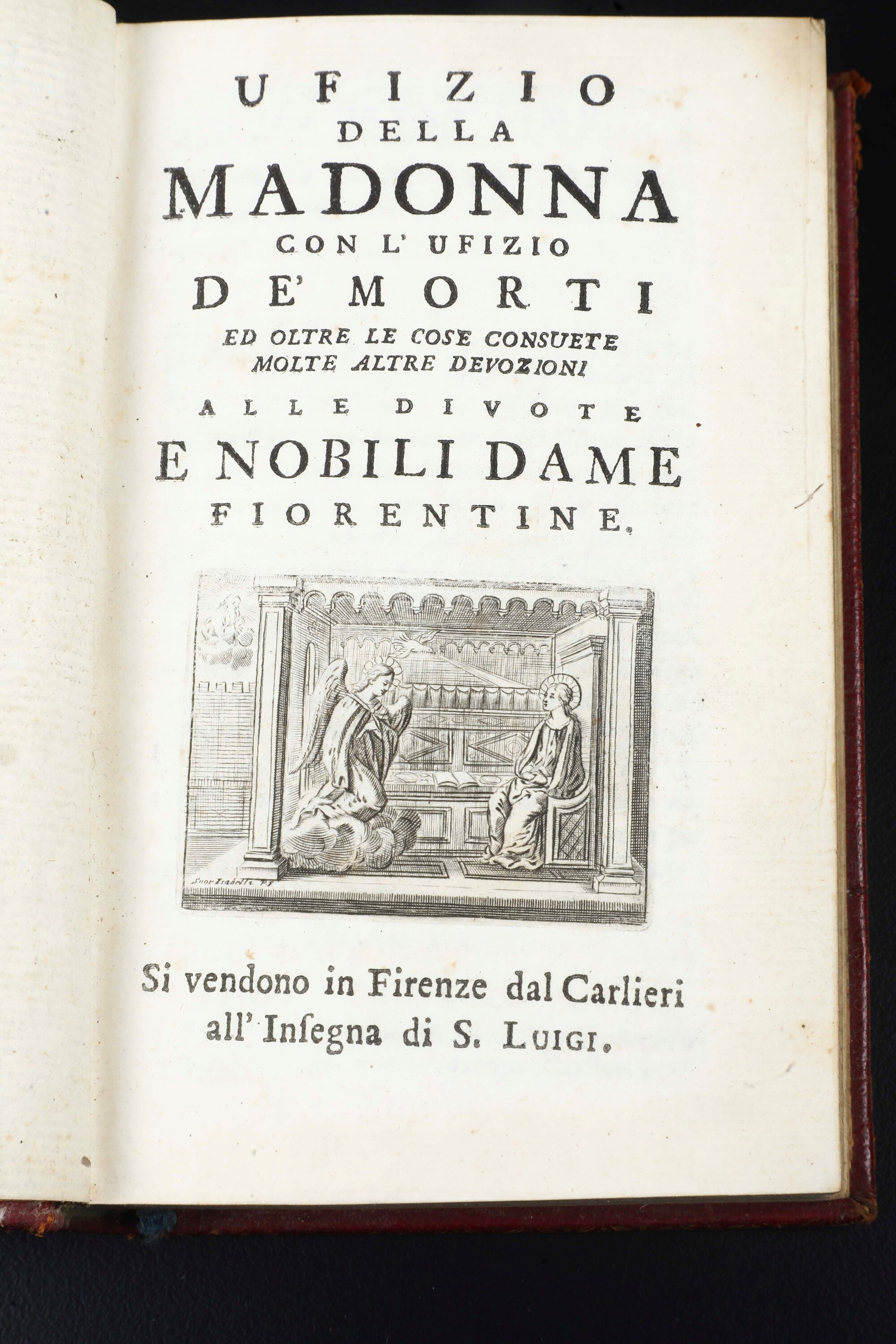 - Ufizio della Madonna con l'Ufizio de' morti. Firenze, Carlieri, s.d. In-8°. Rilegatura del secolo XIX in piena pelle con conici impresse in oro, tagli dorati. Esemplare fresco;