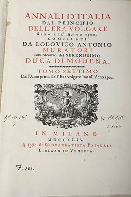 Muratori Lodovico Antonio (1672-1750) Annali d'Italia dal principio dell'era volgare sino all'anno 1500.. In Milano, a spese [..]