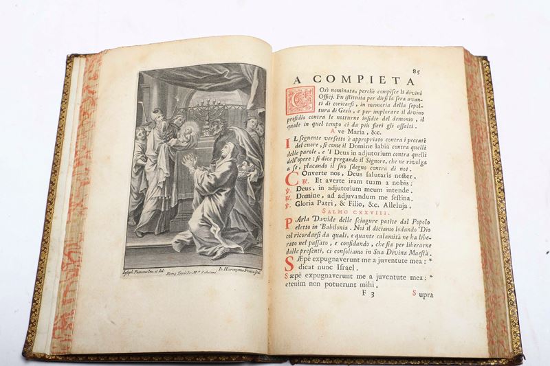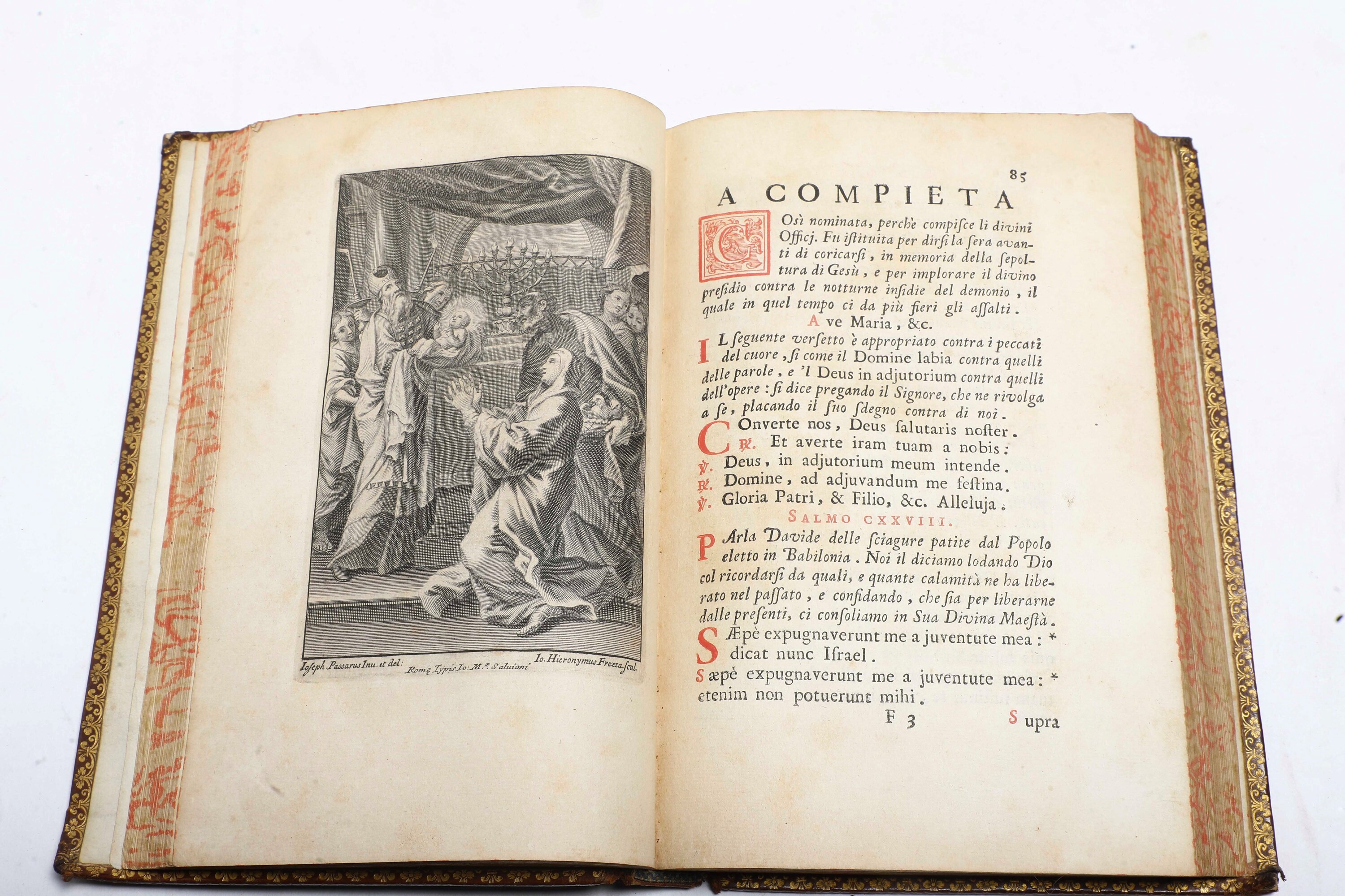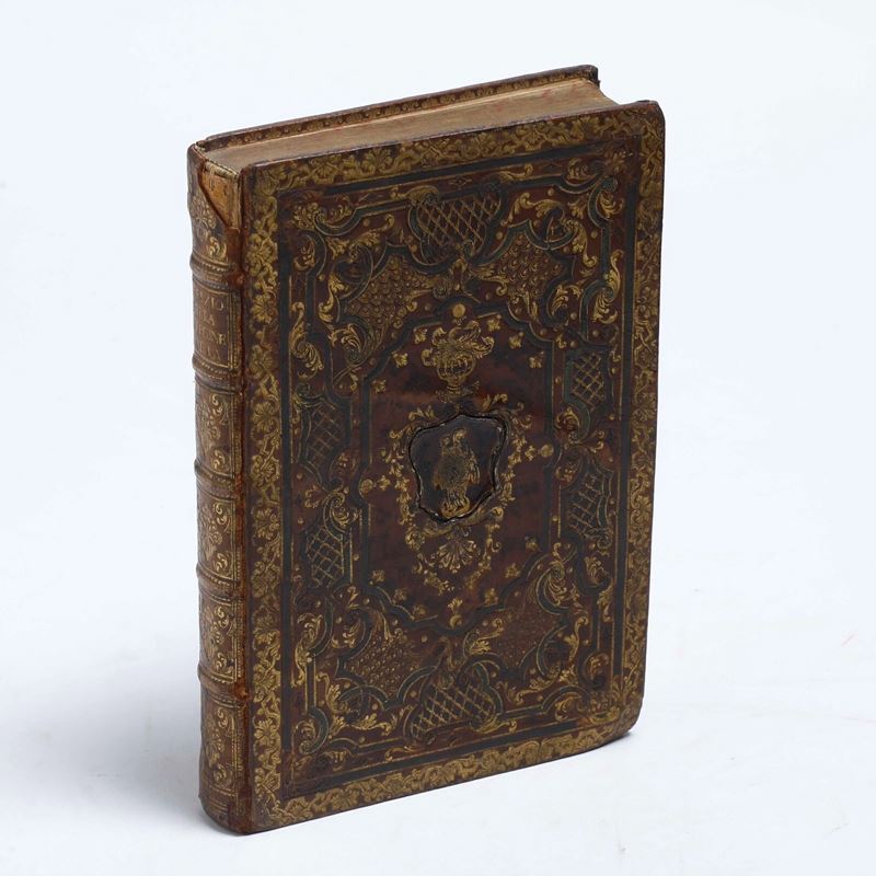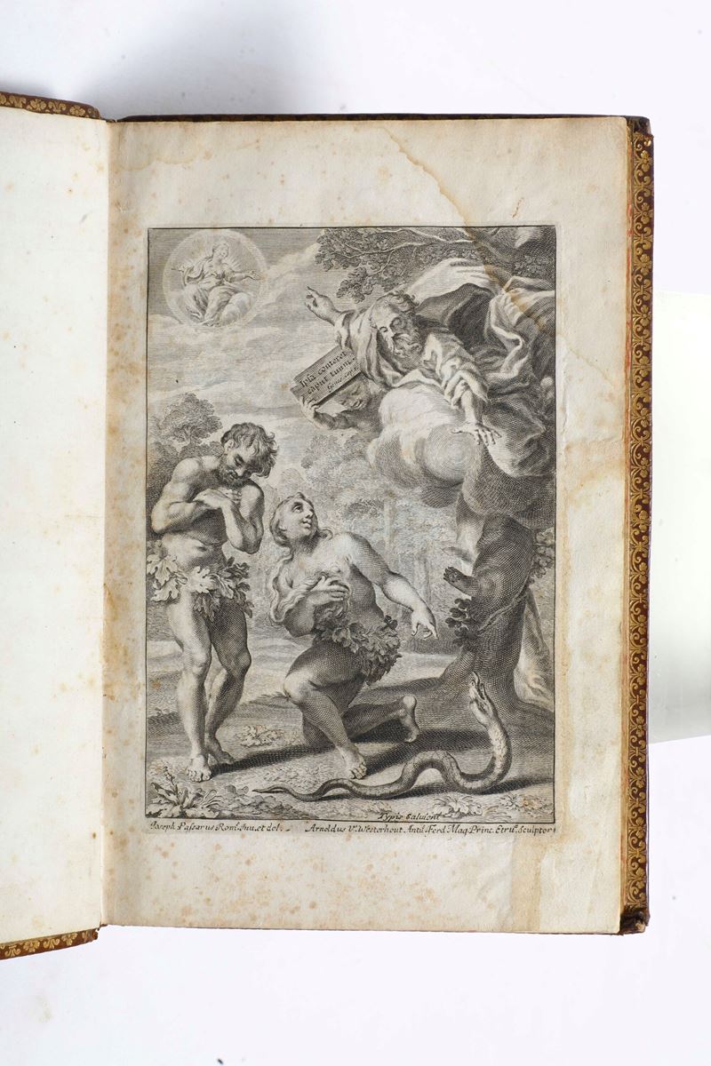 In-4°. Rilegatura coeva in piena pelle riccamente goffrata e dorata, tagli dorati, ex libris nobiliare al contropiatto (fessurazioni alle cerniere, probabili restauri, piccole mancanze al dorso e usure). Bell'incisione raffigurante Adamo ed Eva in antiporta, vignetta al frantespizio con la Natività, iniziali xilografiche. Gore e bruniture alle prime carte, foxing