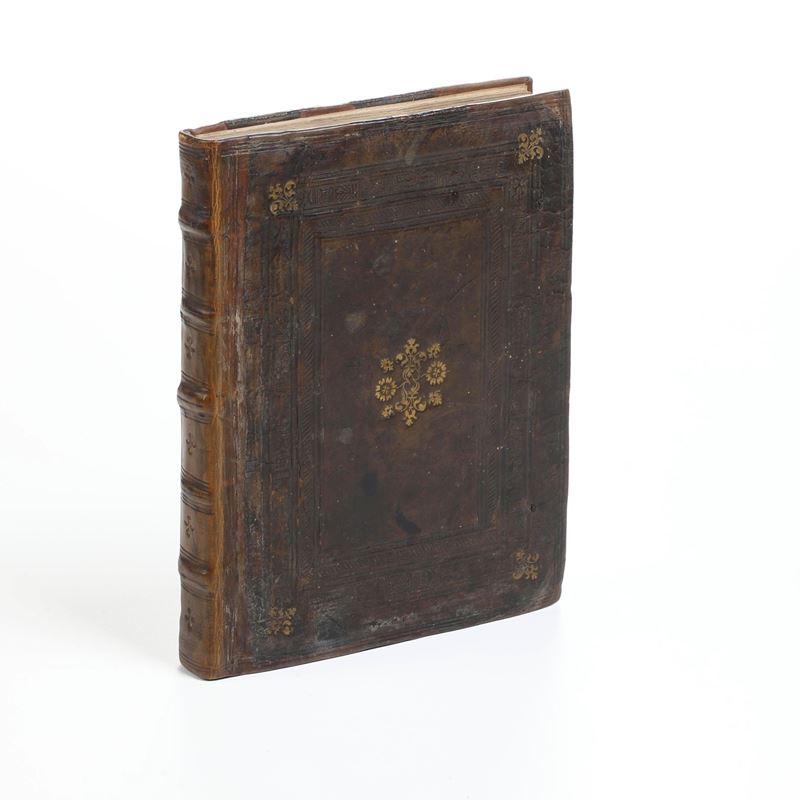 In-4°. (mm 208x150). Rilegature coeva in piena pelle che presenta il dorso ricostruito, ex libris nobiliare inciso al contropiatto anteriore. Frontespizio rifilato al piede, alcune carte interessate marginalmente da fori di tarlo, alcune pagine strappate con perdita di testo