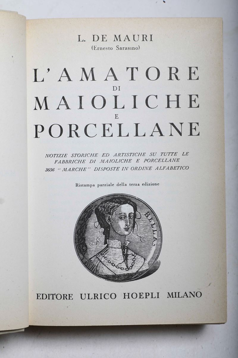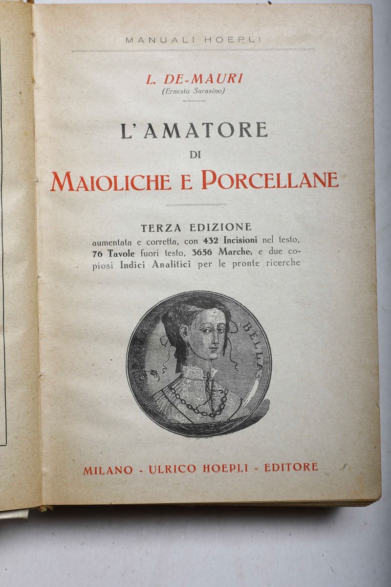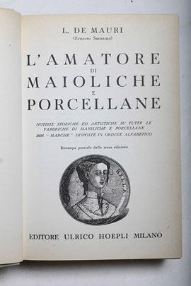 - L. De Mauri, L'amatore di maioliche e porcellane, Milano, Hoepli, III edizione, Milano, Hoepli, s.d.. Rilegatura originale, lievi bruniture e firma di possesso all'antiporta ma buone esemplare.
