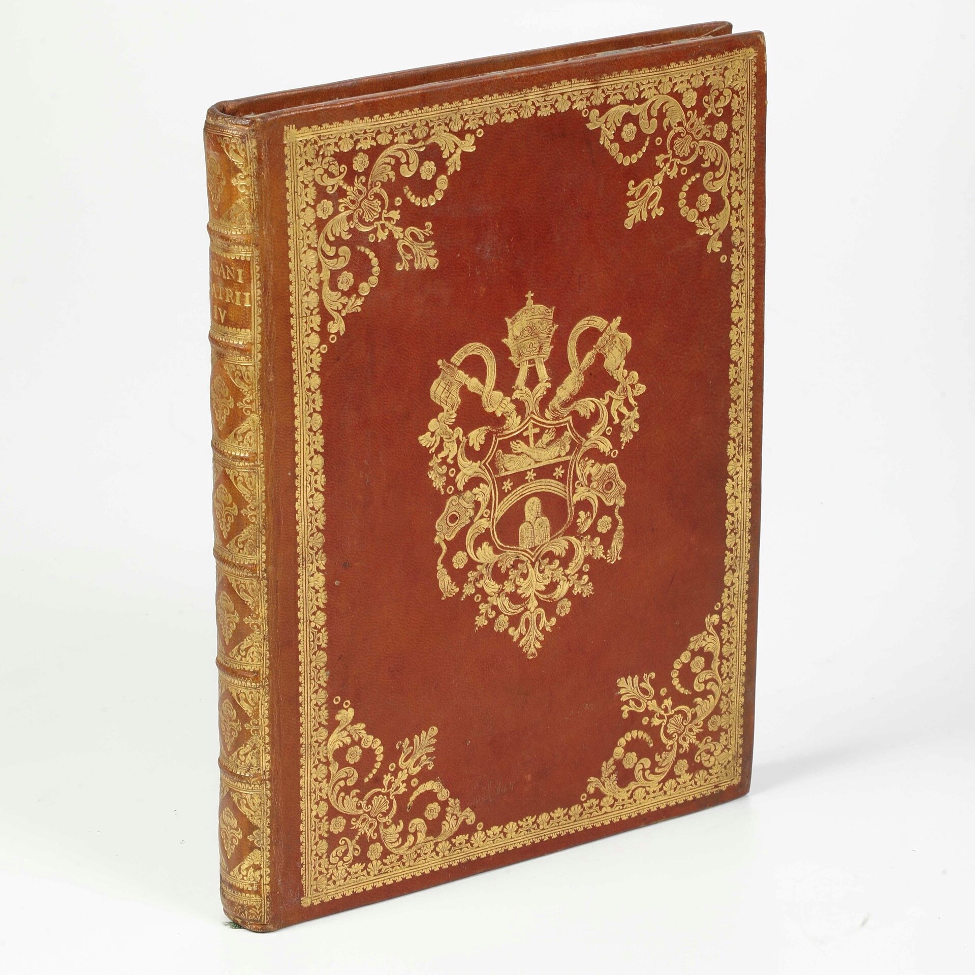 In-folio piccolo. Rilegatura coeva in piena pelle alle armi di Papa Clemente XIV Ganganelli, tagli marezzati, timbro di possesso al frontespizio. Esemplare fresco e marginoso, con rare e piccole macchie e una piccola nota manoscritta al frontespizio