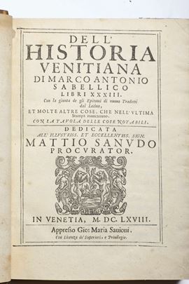 Sabellico Marco Antonio (1436-1506) Dell'historia Venitiana.. In Venetia, appresso Gio. Maria Savioni, 1668