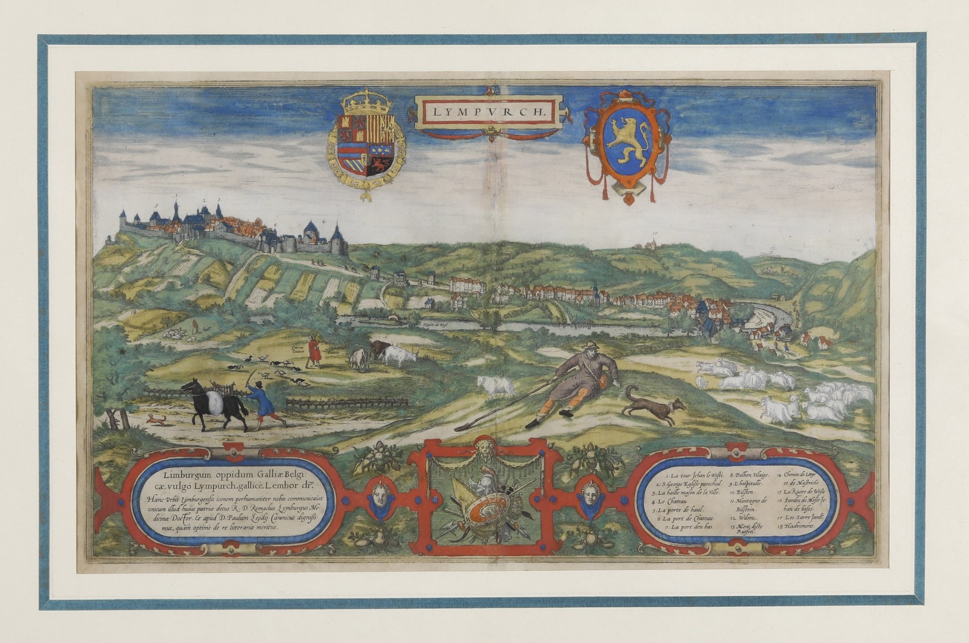 Bella incisione della città di Lympurch, situata nel Belgio, tratta dalla monumentale opera Civitates Orbis Terrarum, pubblicata a Colonia dopo il 1575. Coloritura brillante. Traccia di piegatura al centro e restauro. Entro cornice in legno. Dimensioni: 51x33 cm