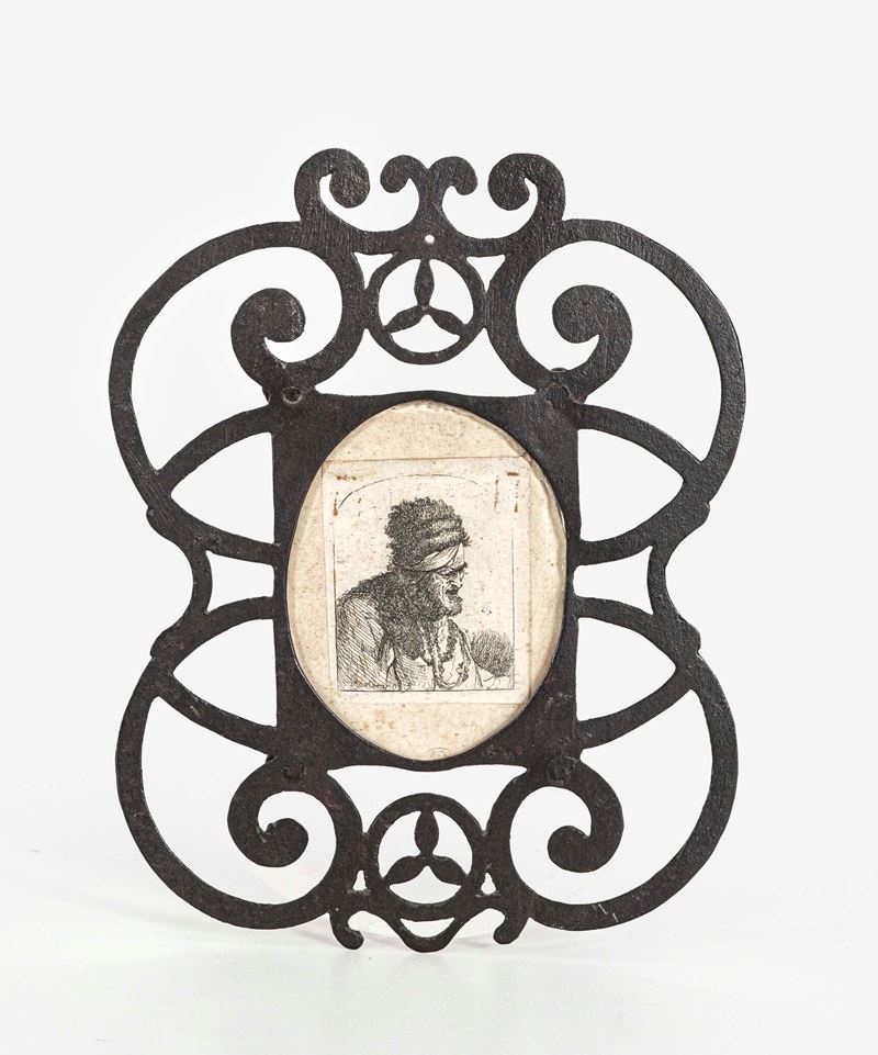 Piccola incisione su carta. Buona impressione. Entro cornice in ferro battuto traforato. Dimensioni: 13x16 cm
