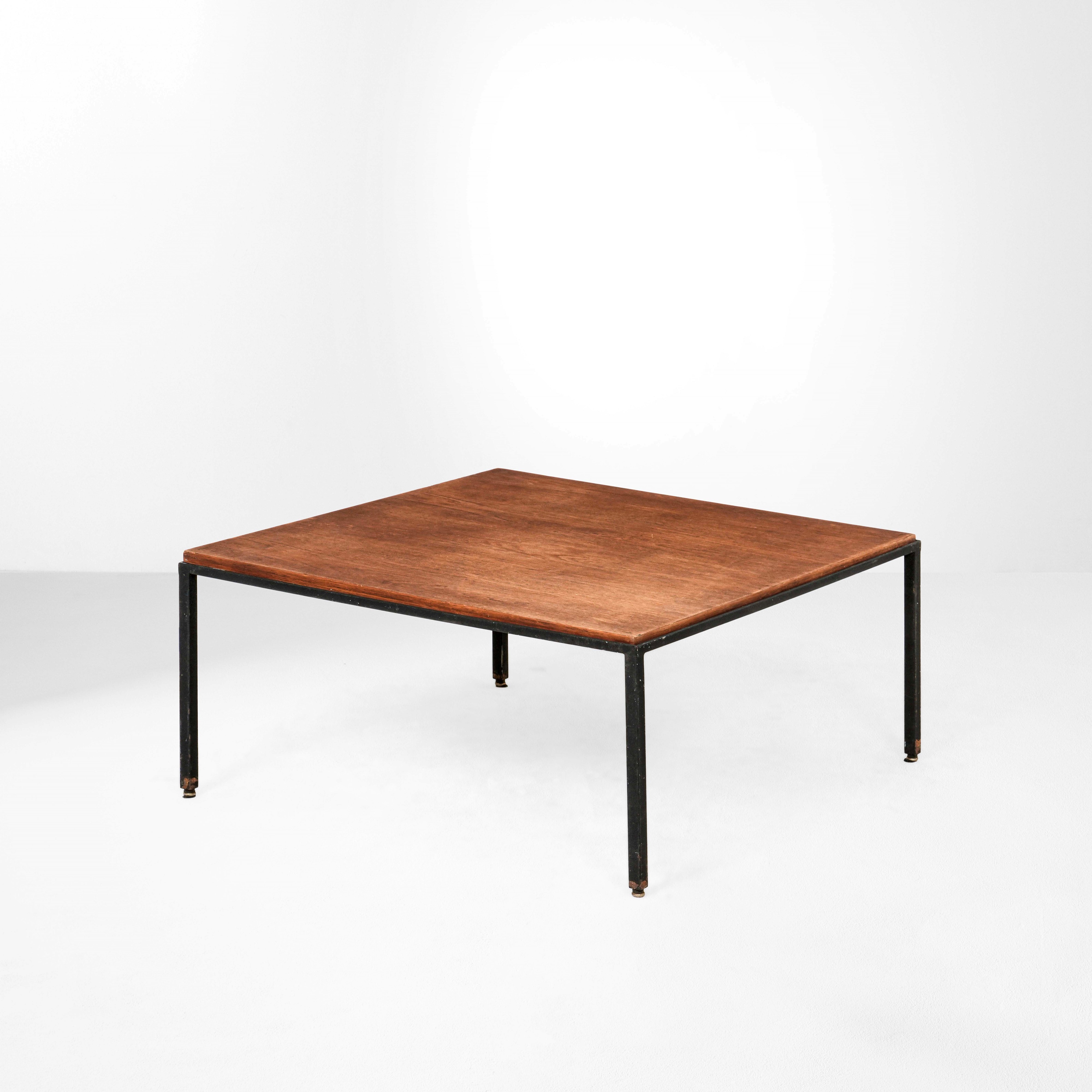 Struttura in metallo laccato, piano in legno e puntagli in ottone.