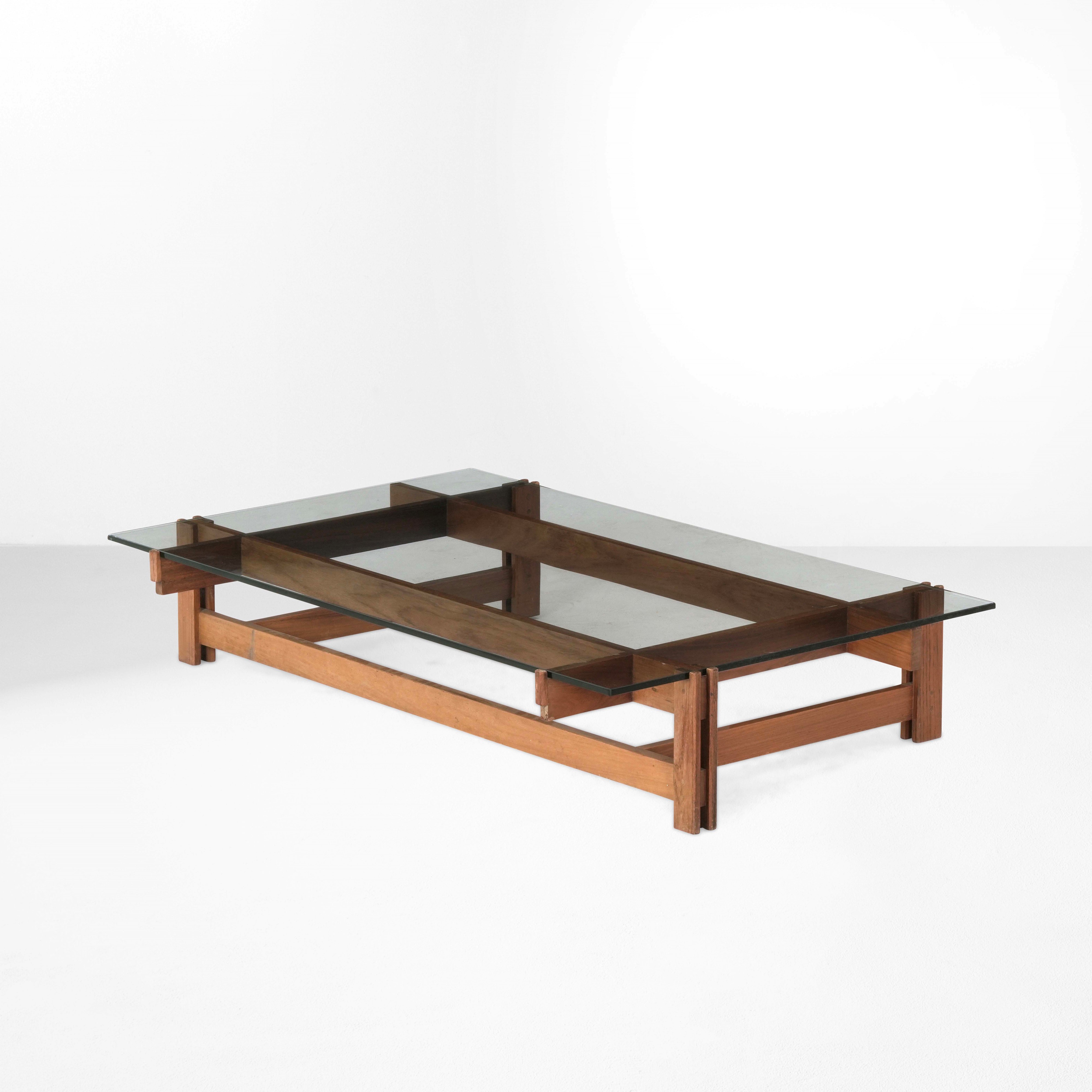 Struttura e sostegni in legno con piano in cristallo molato.