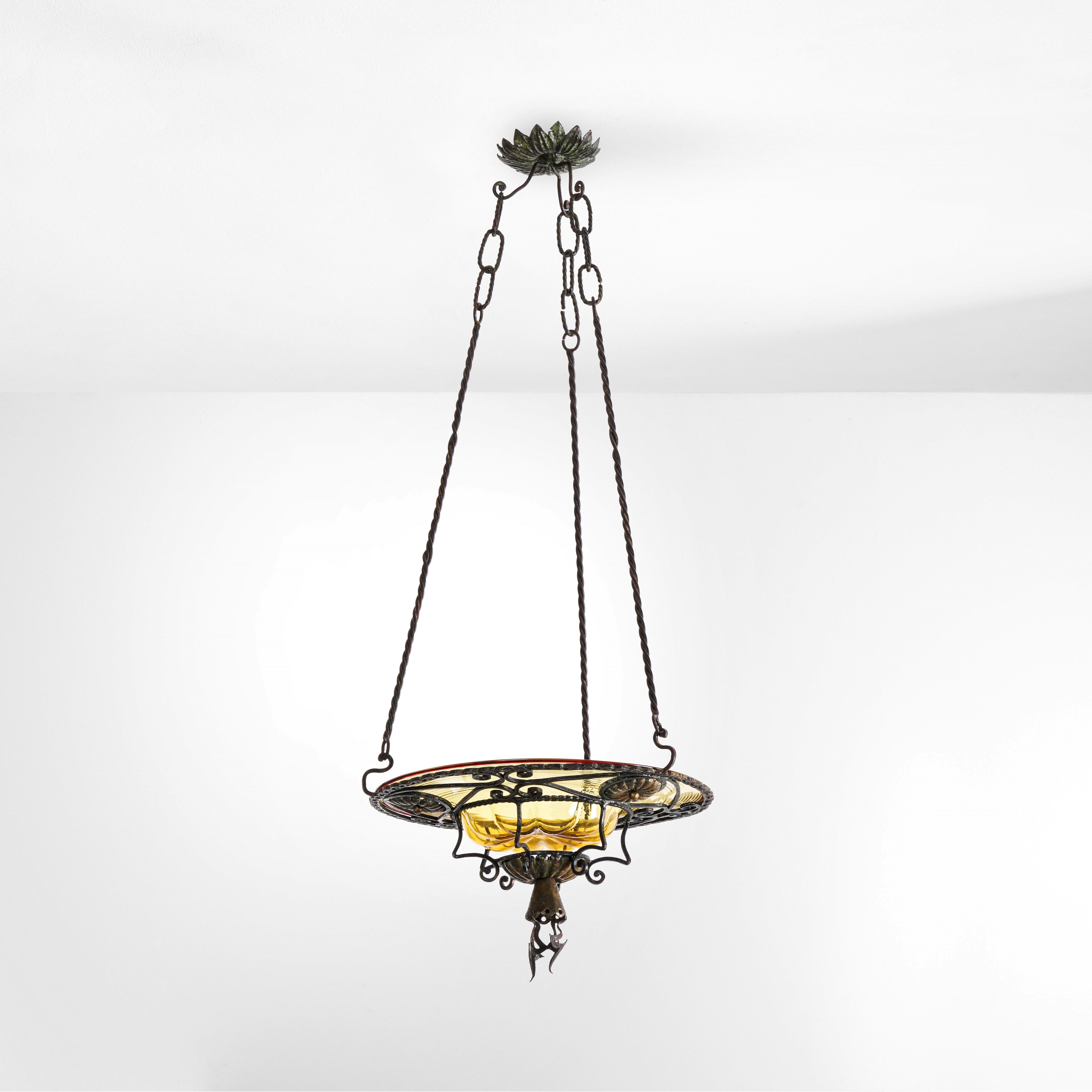 Struttura in ferro battuto, diffusore in vetro di Murano colorato.