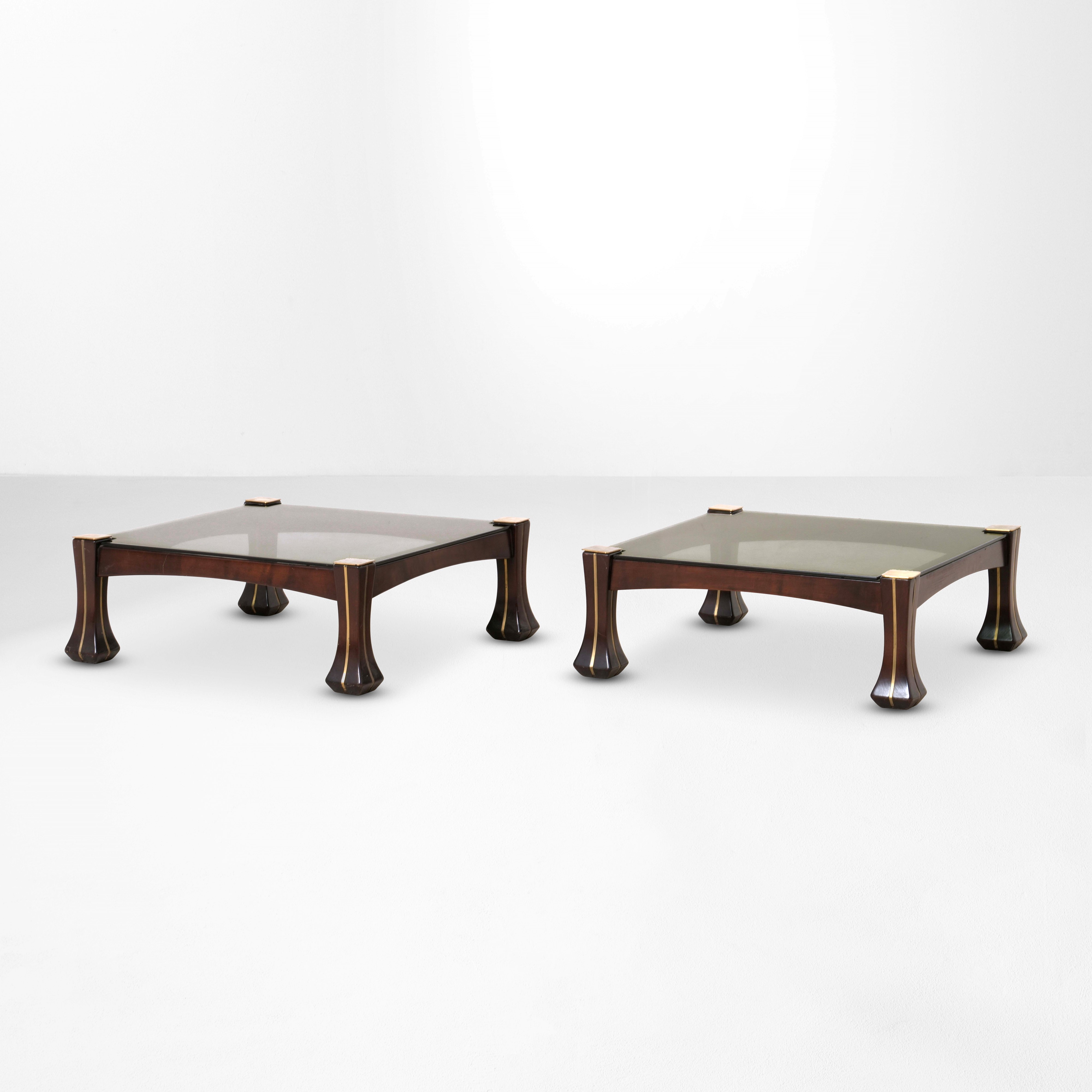 Struttura in legno con dettagli in ottone, piani in vetro colorato.