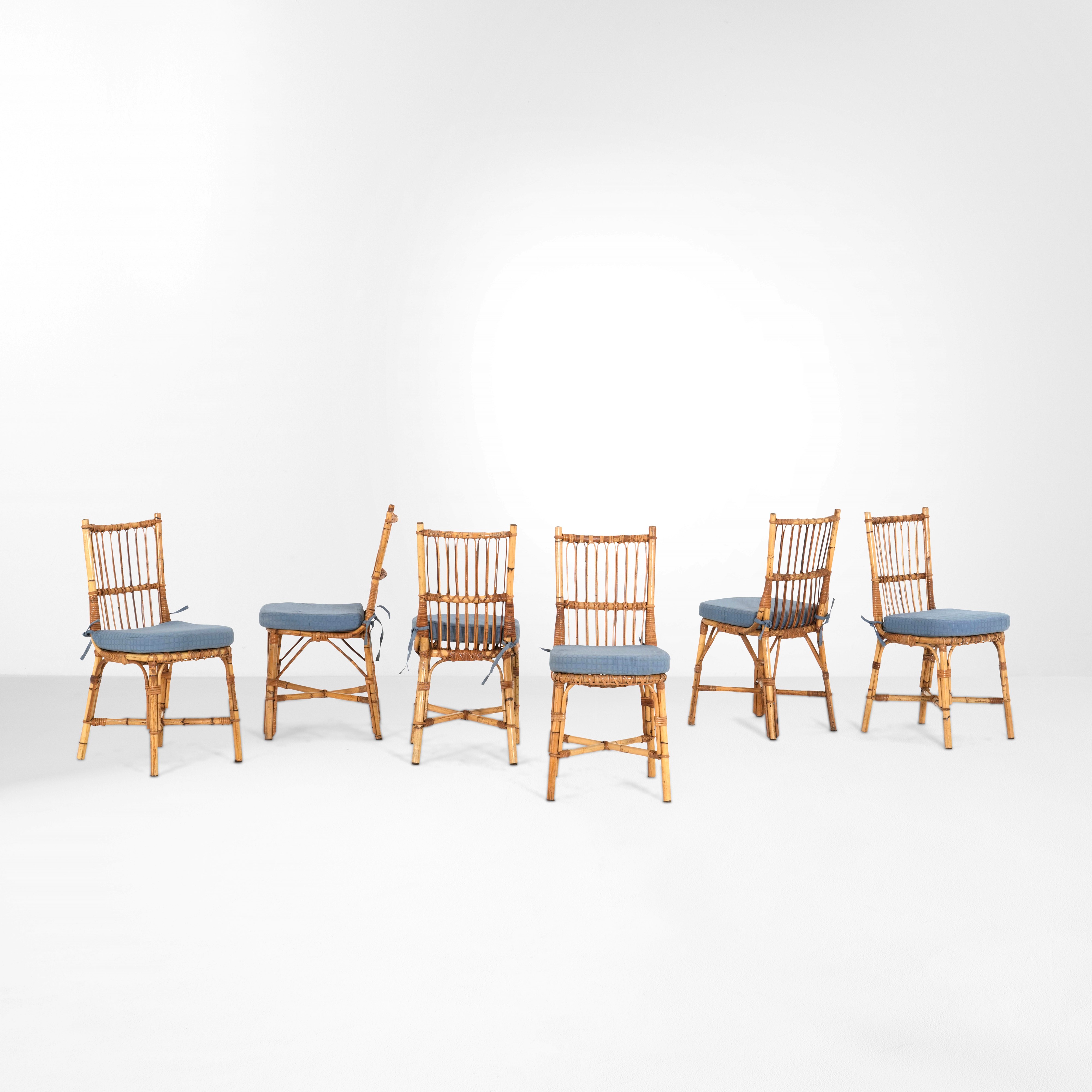 Struttura in bambù e vimini. Cuscini rivestiti di tessuto.