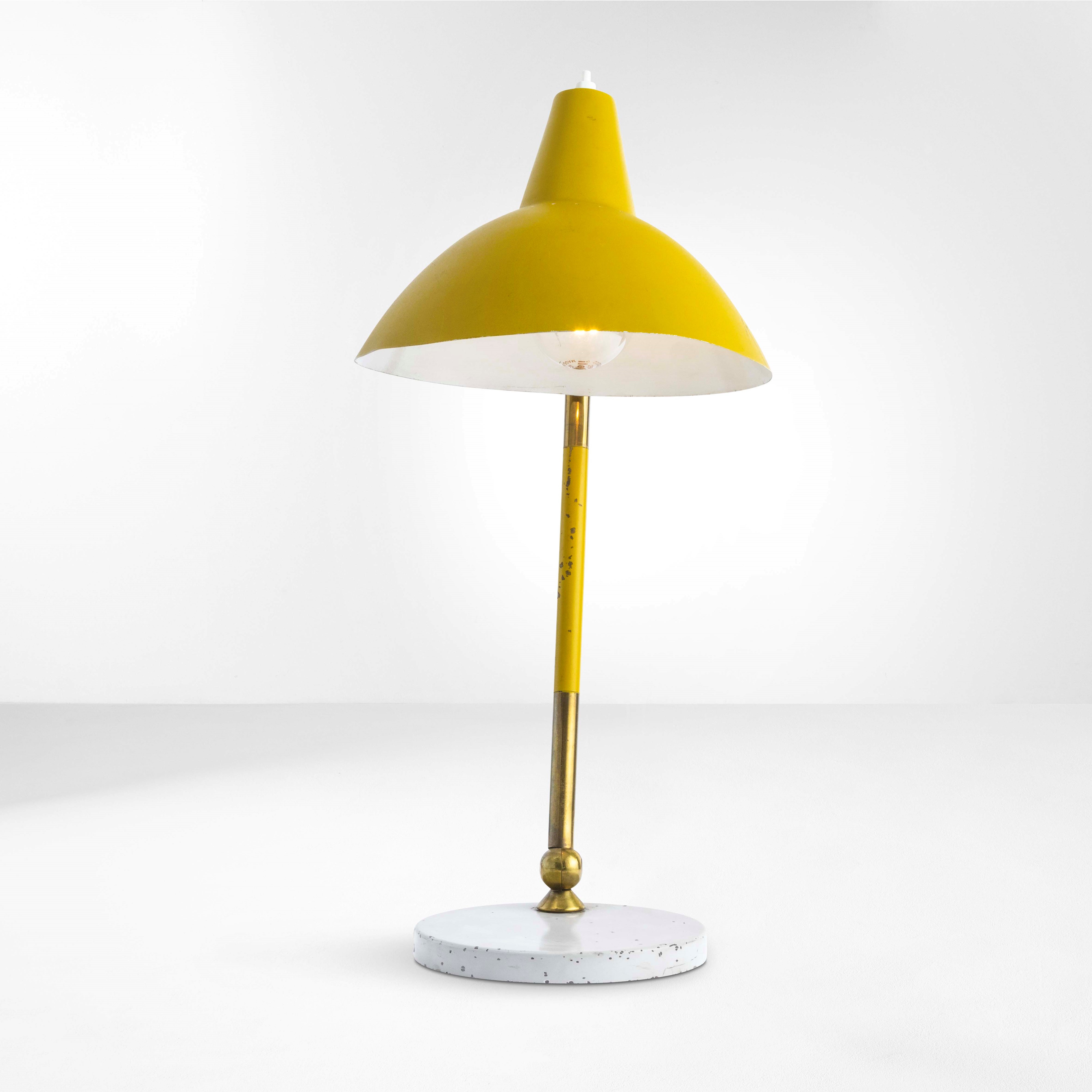 Struttura in ottone, paralume e base in metallo laccato.