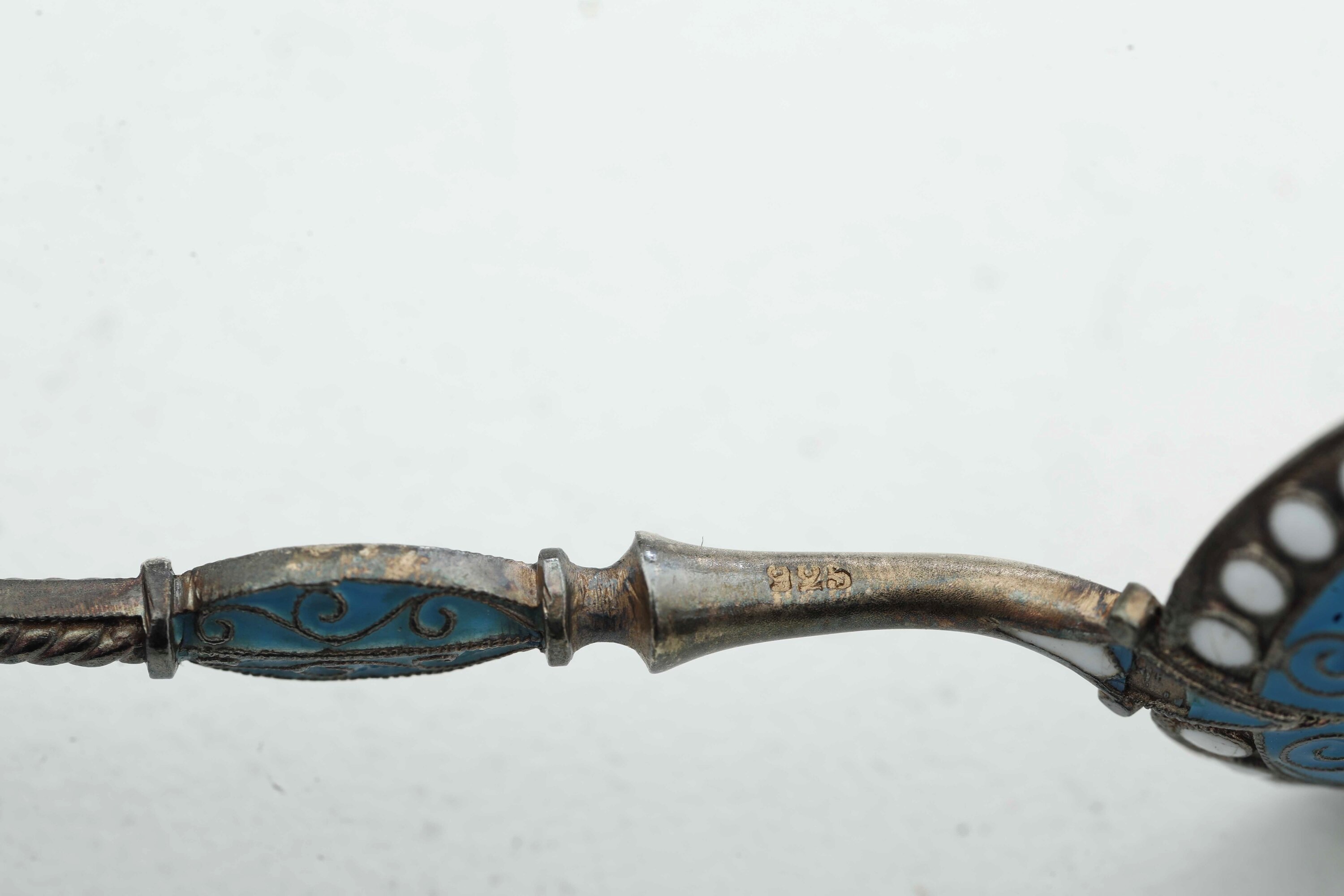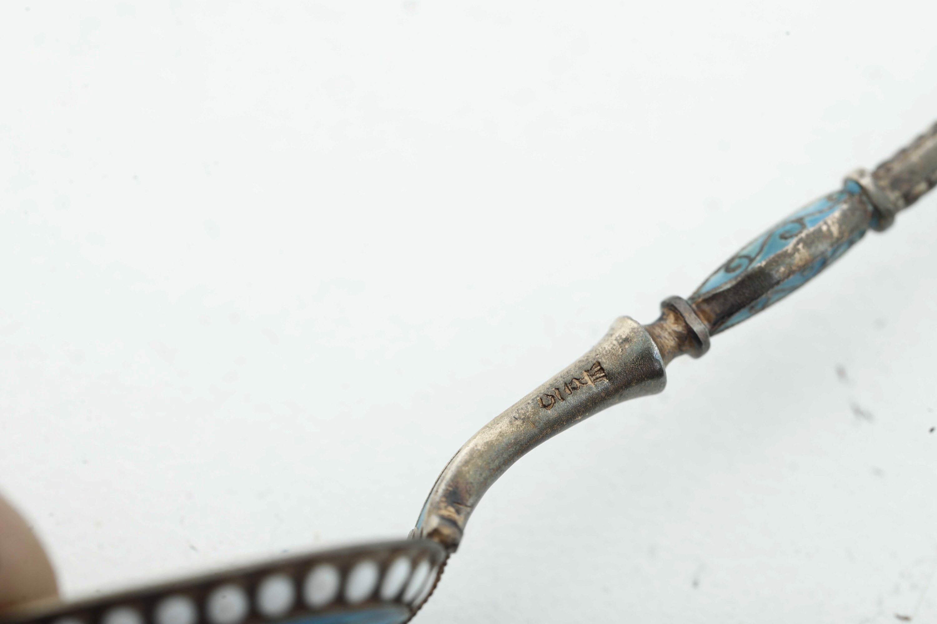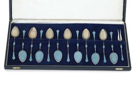Dodici cucchiaini e una forchettina con smalti color turchese. Manifattura del XX secolo