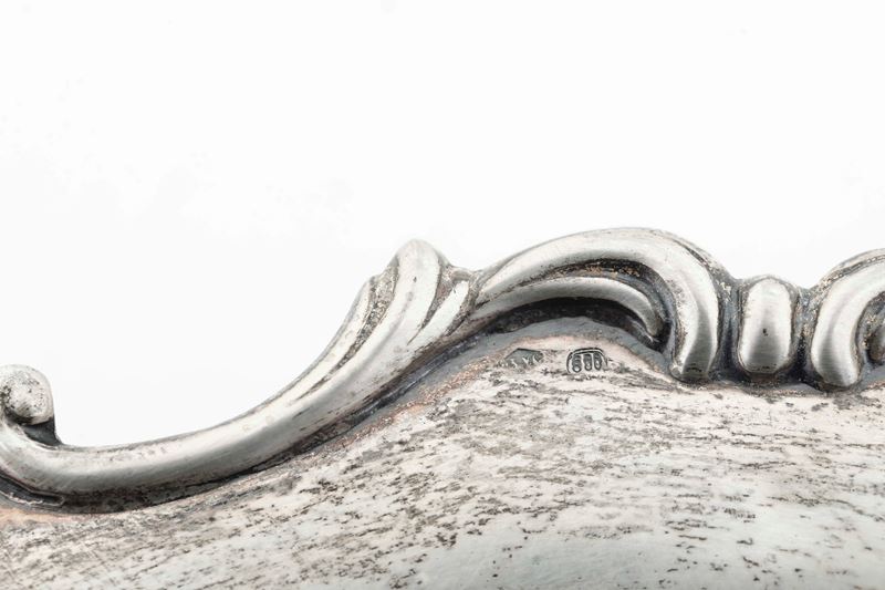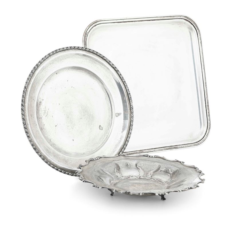 Due piatti e vassoio quadrato. Argenteria italiana del XX secolo, argentieri differenti