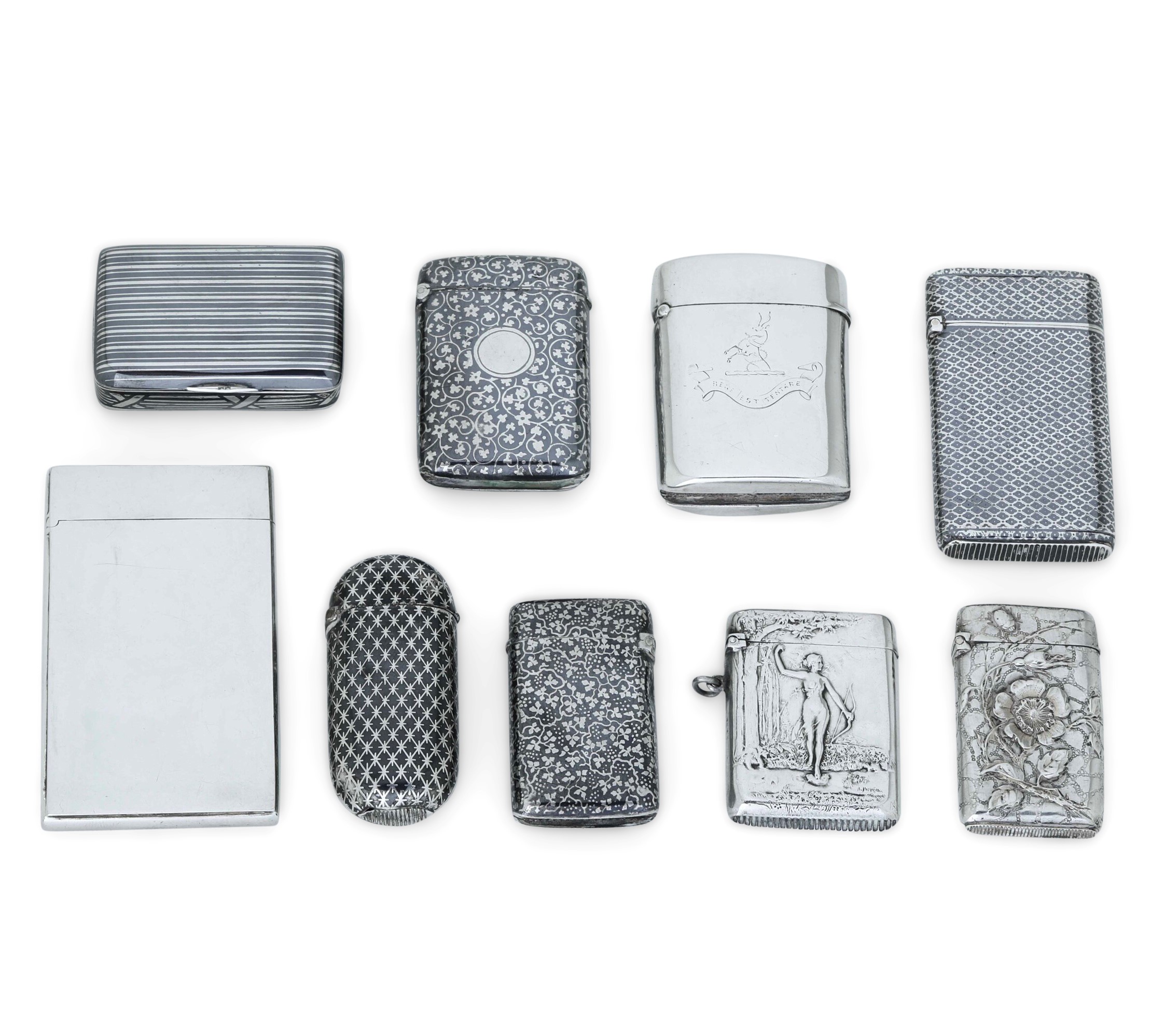Insieme di otto portafiammiferi e una scatola. Differenti manifatture europee, inizio XX secolo