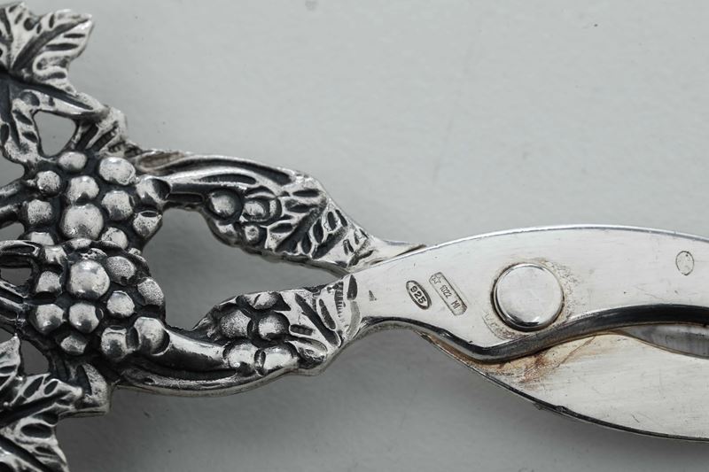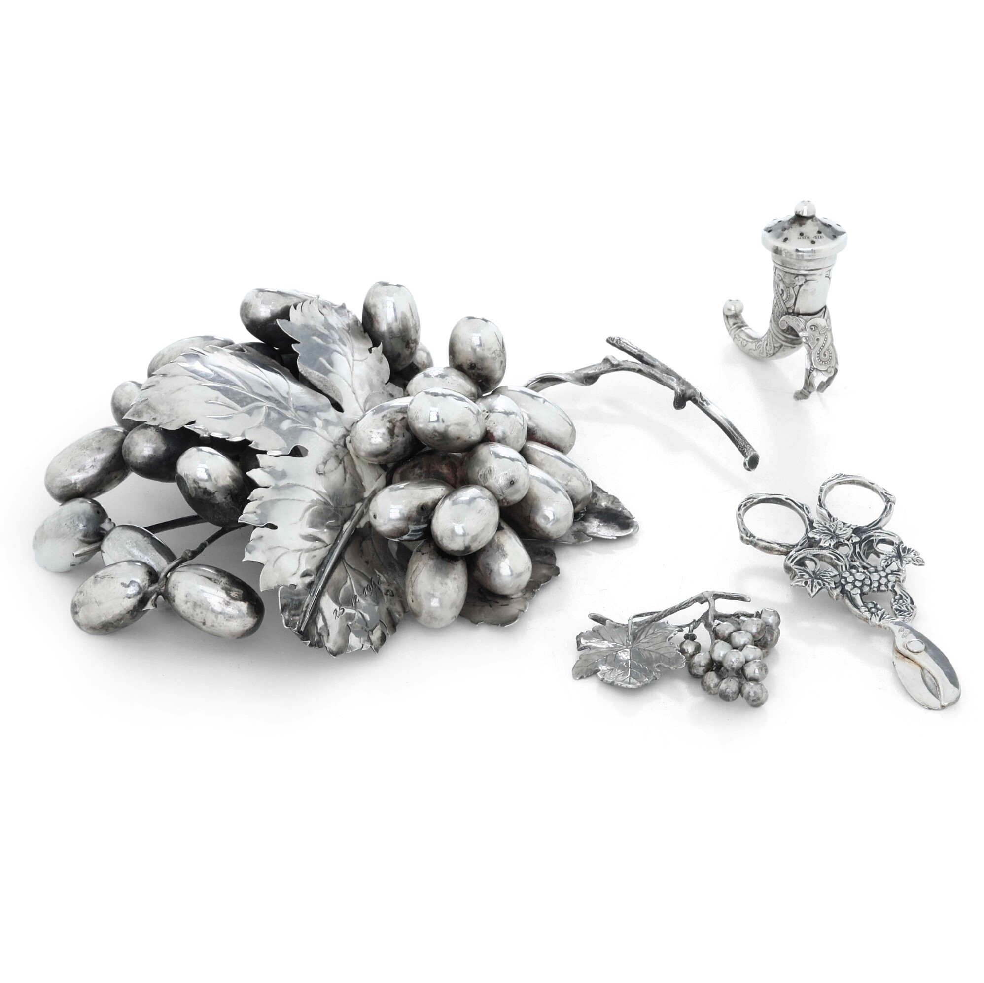 Lotto composto da un grappolo di uva grande ed uno piccolo, forbici con uva ed una piccola salierina a cornucopia. Argenteria italiana del XX secolo, argentieri differenti