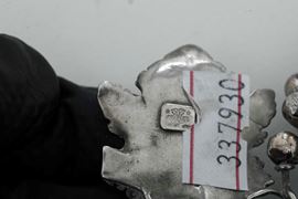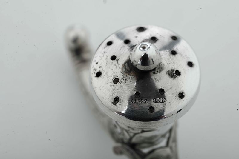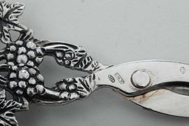 Lotto composto da un grappolo di uva grande ed uno piccolo, forbici con uva ed una piccola salierina a cornucopia. Argenteria [..]