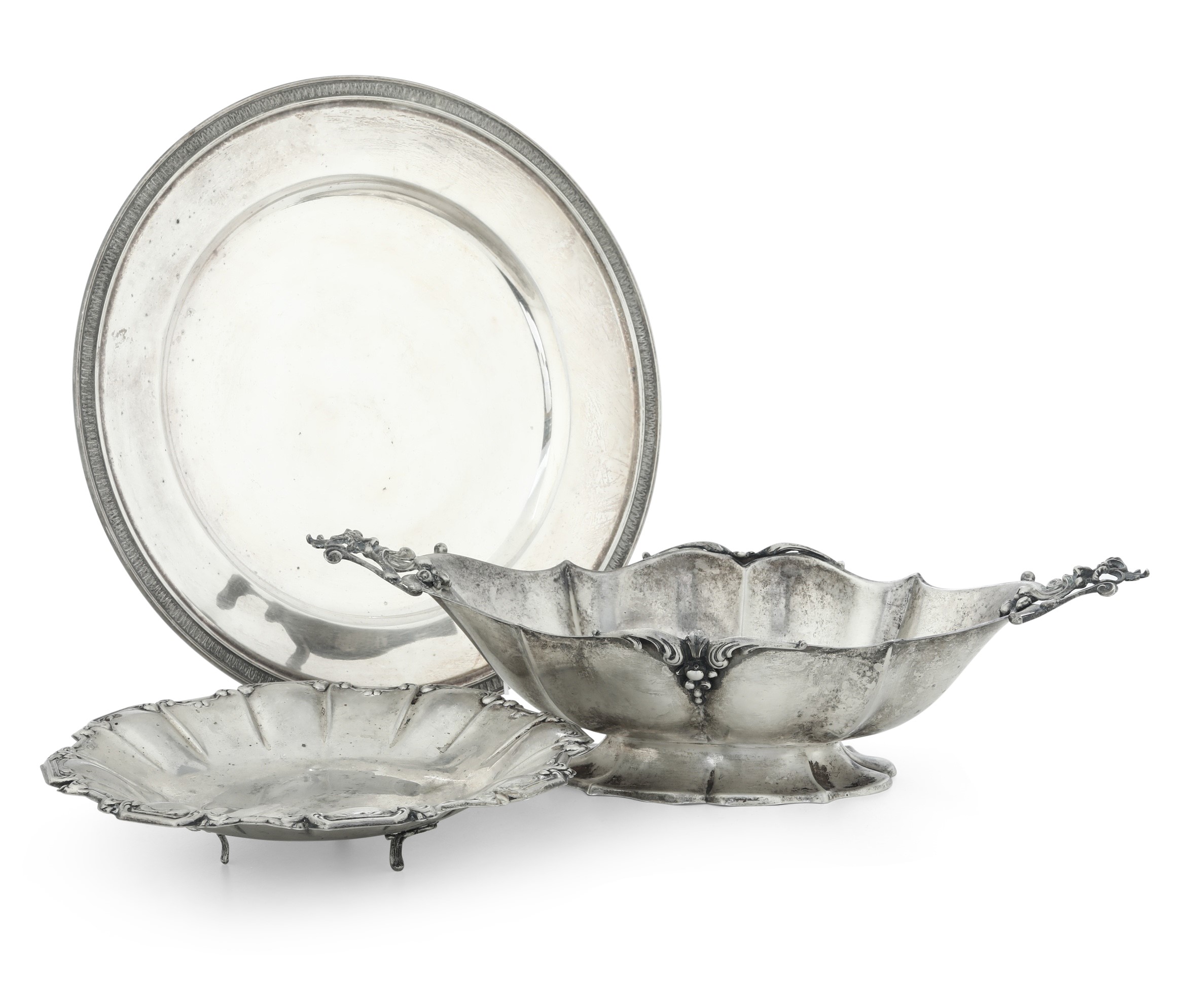 Lotto composto da un piatto e da due centrotavola. Argenteria italiana del XX secolo; i due centrotavola marchiati con bollo con fascio littorio in uso dal 1935 al 1945