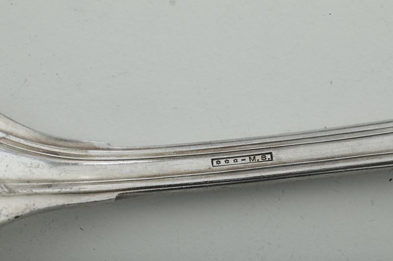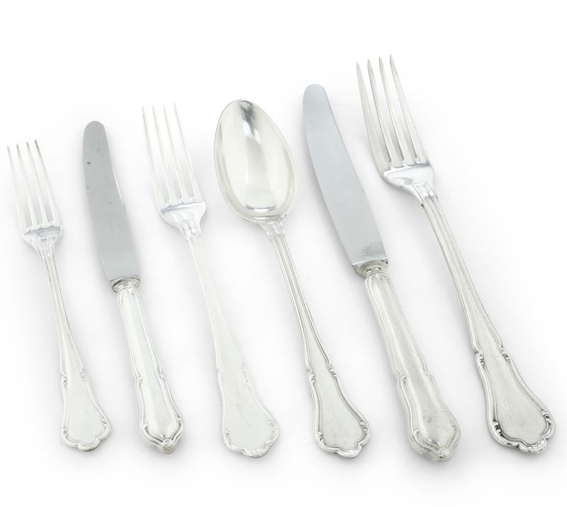 lotto composto da 12 forchette,11 cucchiai e coltelli grandi,12 forchette e coltelli da frutta ed una forchetta da portata