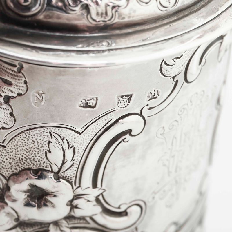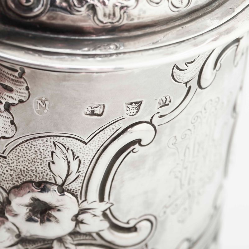 Tankard. Londra 1727. Marchio dell’argentiere parziale di difficile identificazione (J. Millington?) e altri marchi per Londra 1877 e dell’argentiere Frederick Brasted