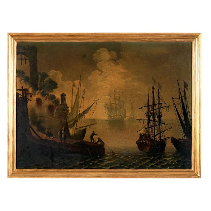 Veduta di porto con imbarcazioni e pescatori