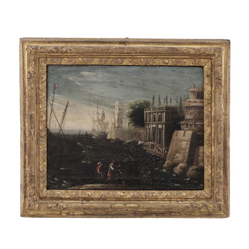 Scuola del XVIII secolo Capriccio costiero con figure e imbarcazioni