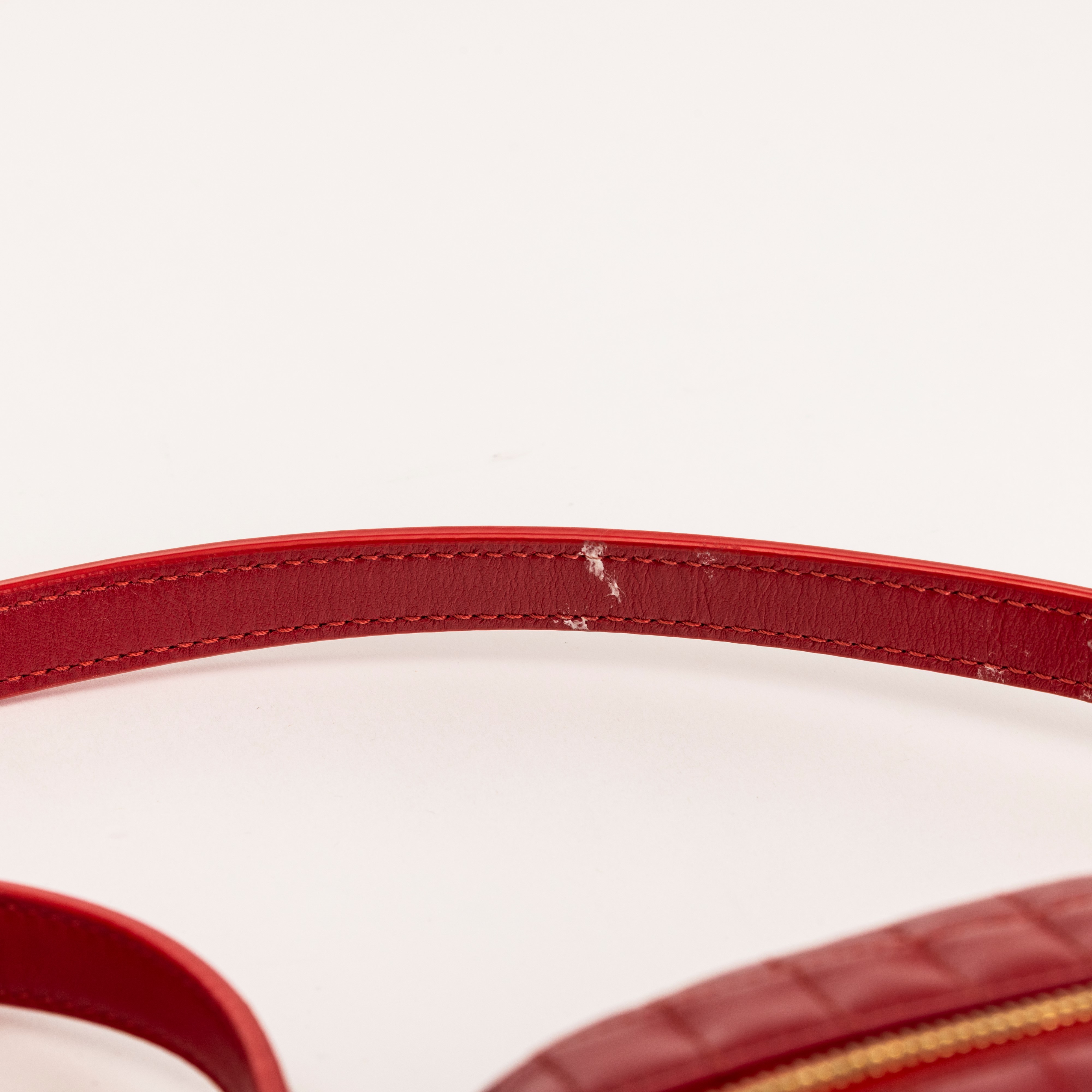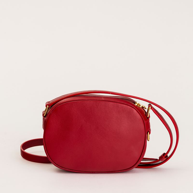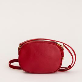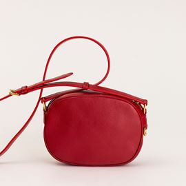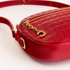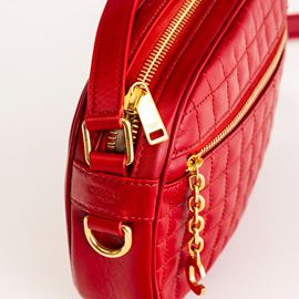In pelle metelassé rossa e dettagli dorati.