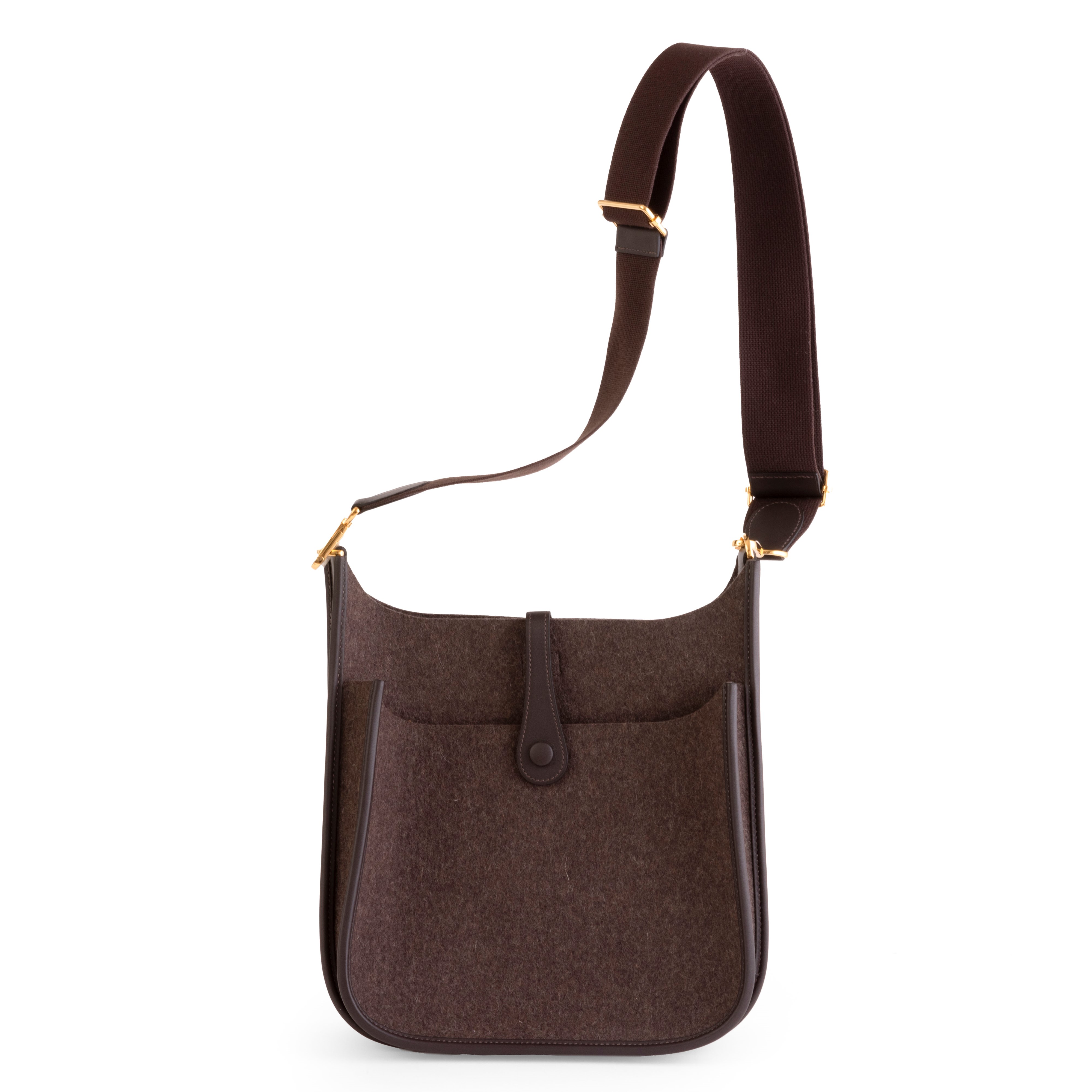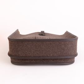 In pelle e feltro scuro e hardware dorato.