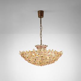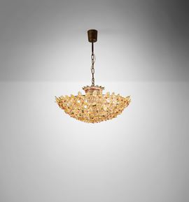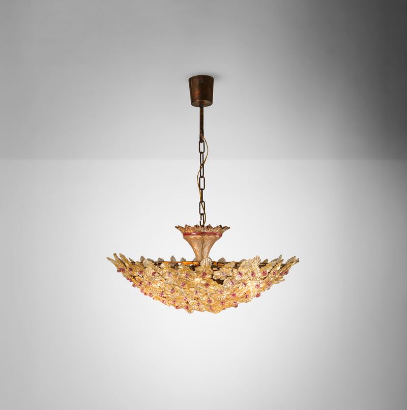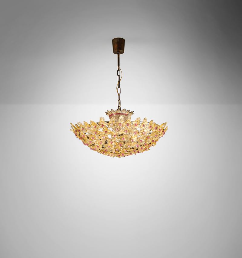 Struttura in metallo con elementi diffusori in vetro di Murano policromo decorato a foglia oro.