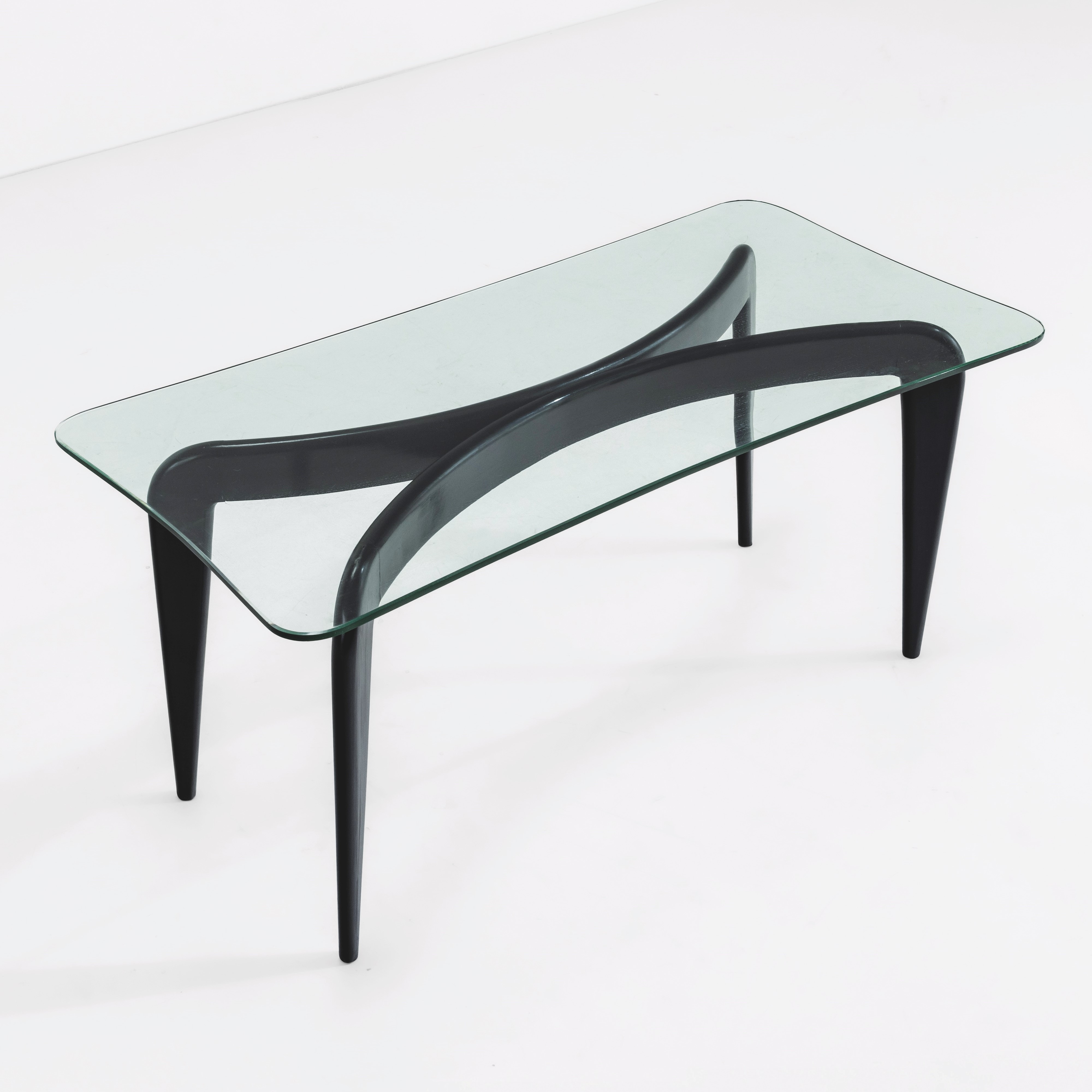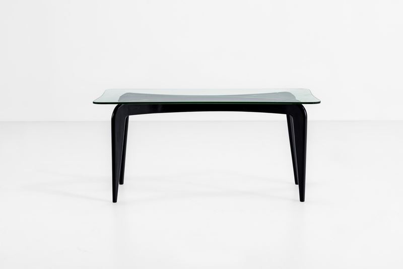 Struttura in legno laccato, piano in cristallo molato.