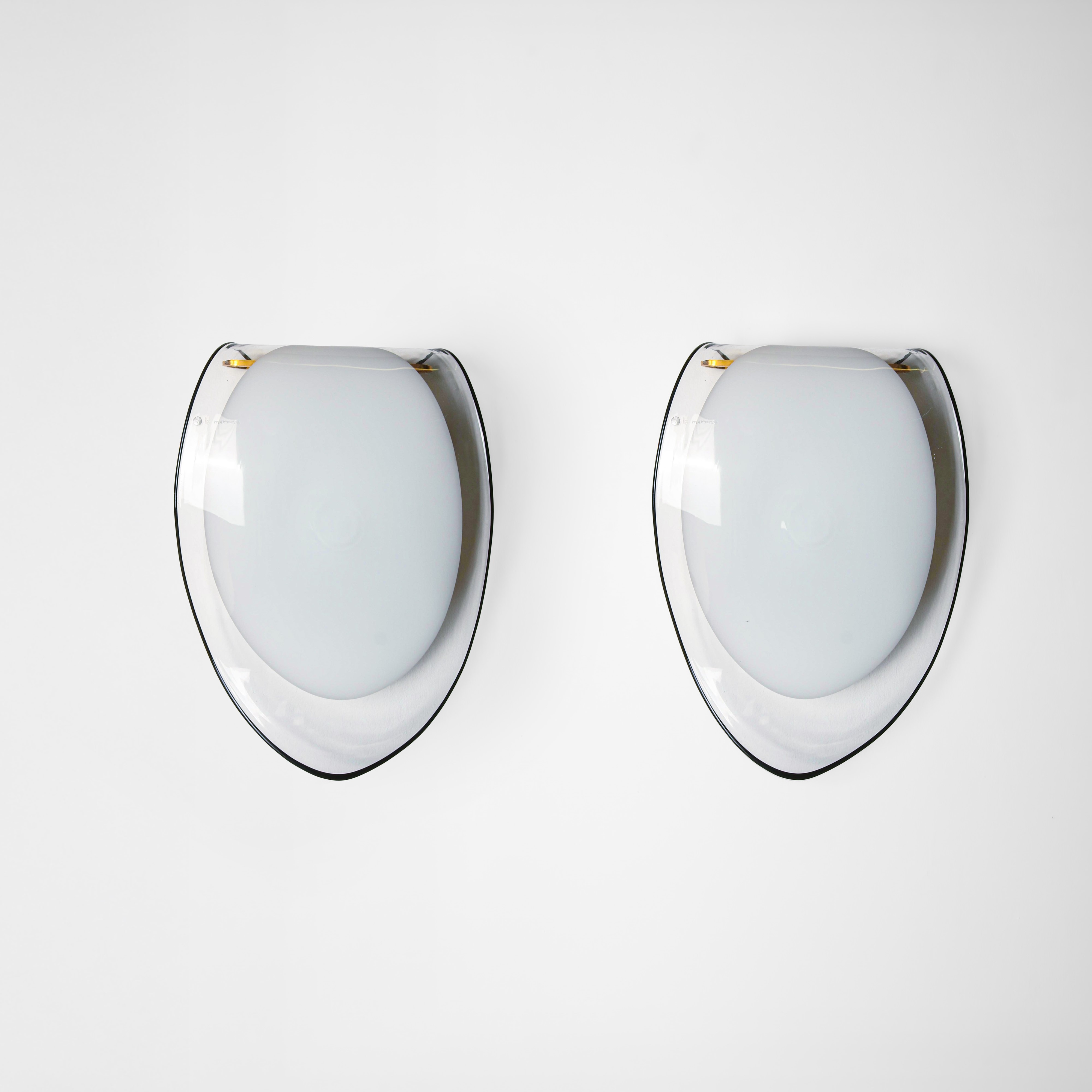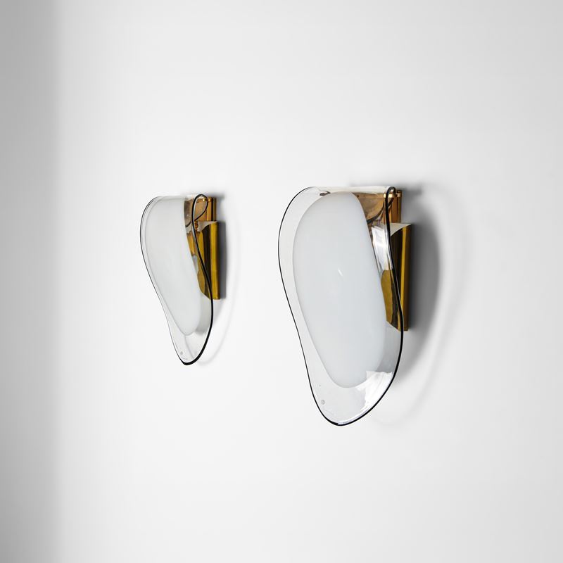 Struttura in ottone e diffusore in vetro lattimo e trasparente.