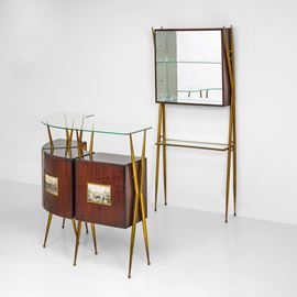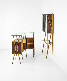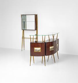Struttura in legno con sostegni in ottone. Piani e rivestimenti in vetro e vetro specchiato.