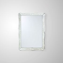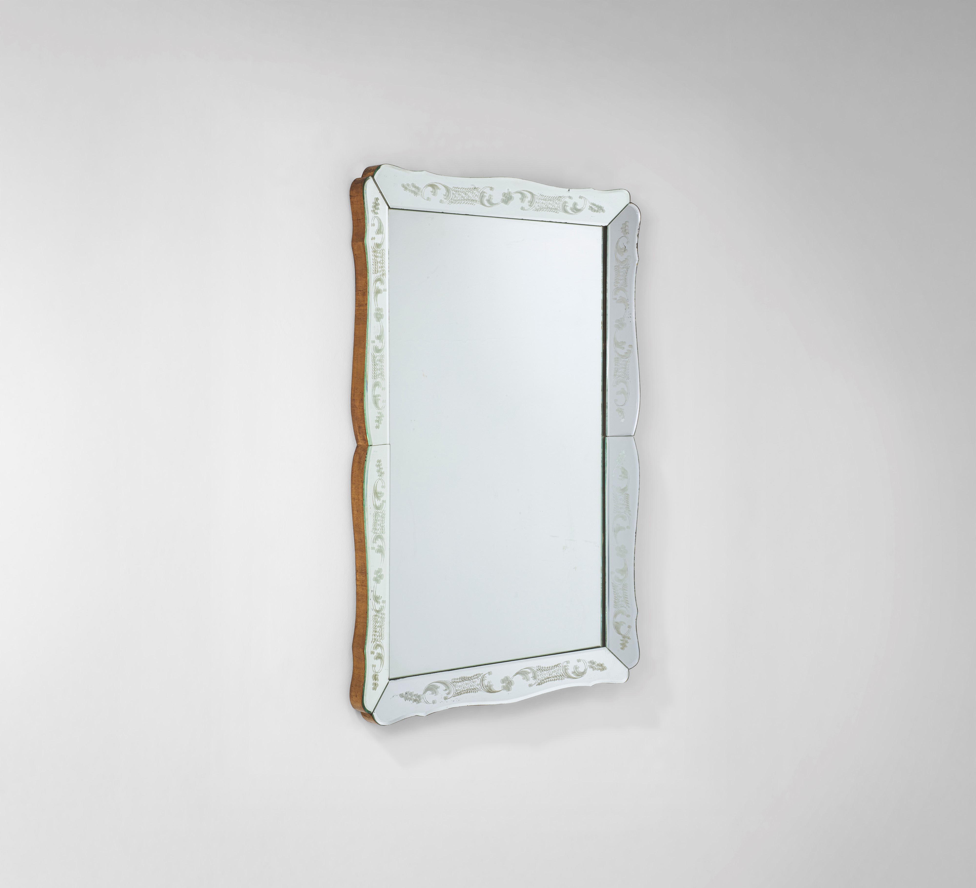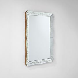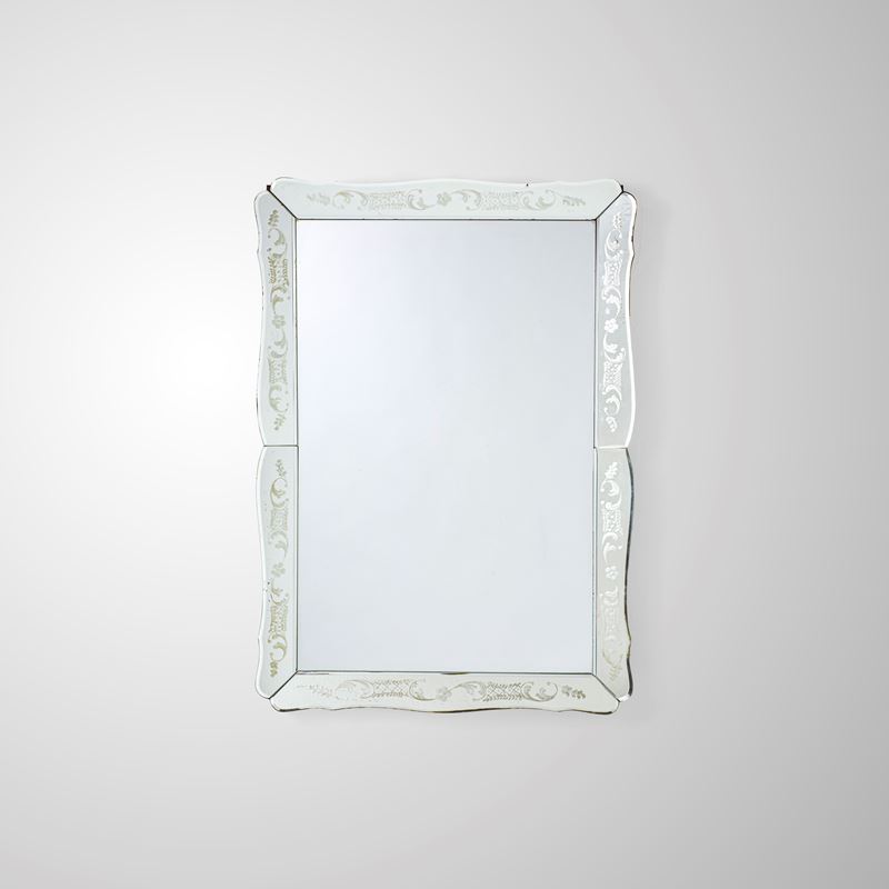 Struttura in legno, cornice in cristallo decorato a getto di sabbia e argentato.