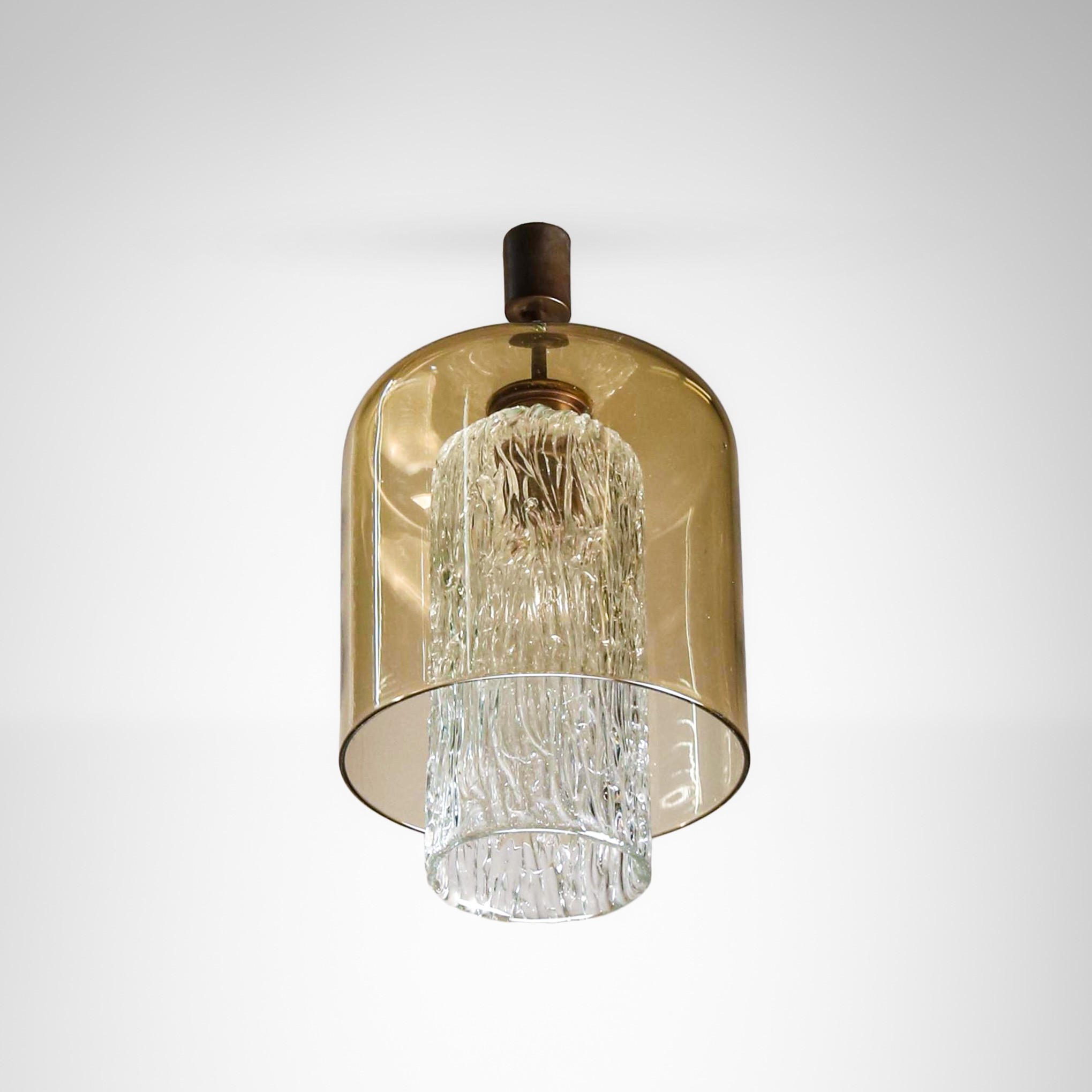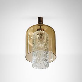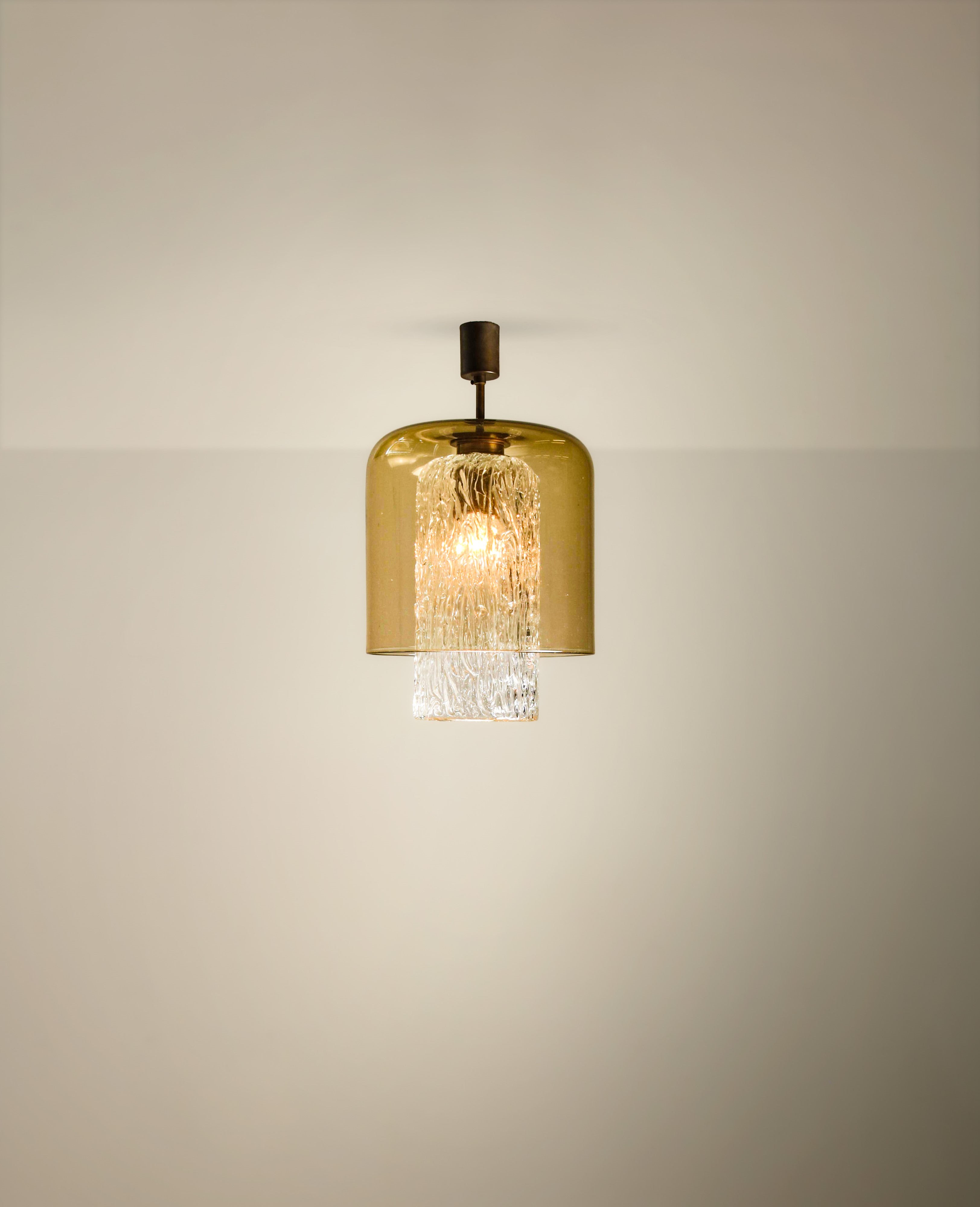 Struttura in ottone, diffusori in vetro di Murano e vetro di Murano a corteccia.
