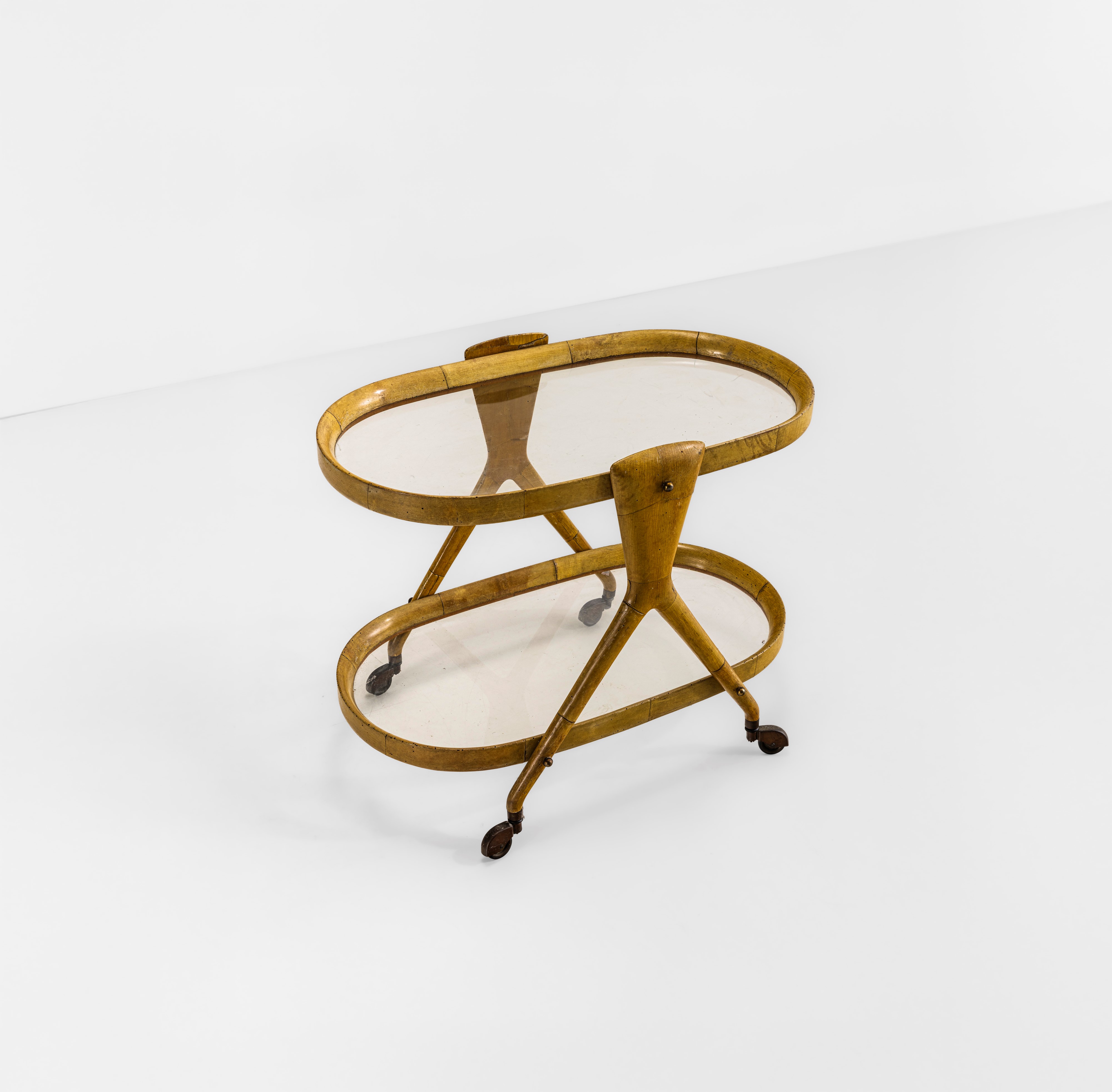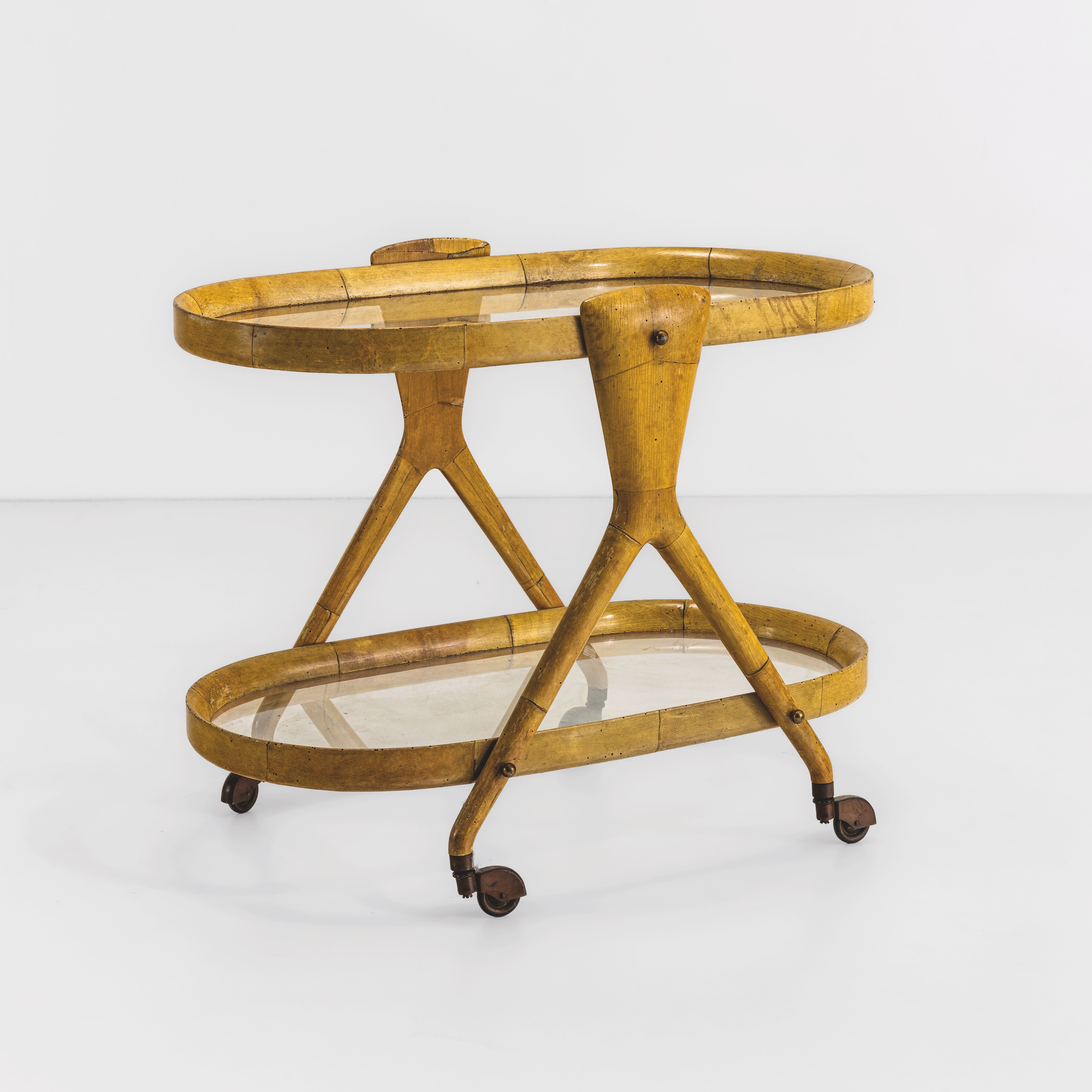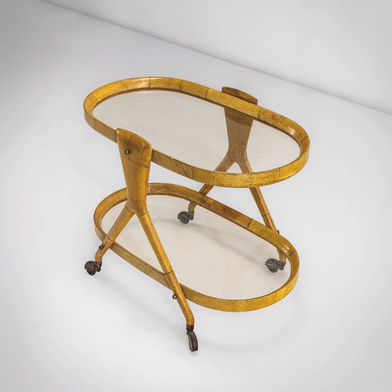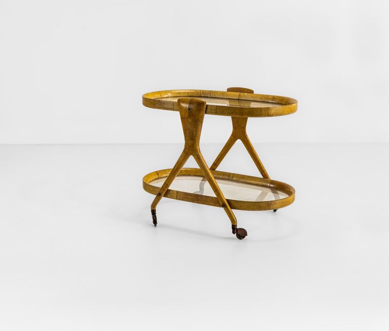 Struttura in legno con rivestimenti in pergamena, ripiani in vetro, dettagli in metallo.
